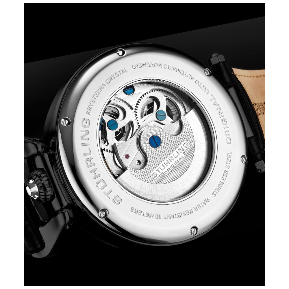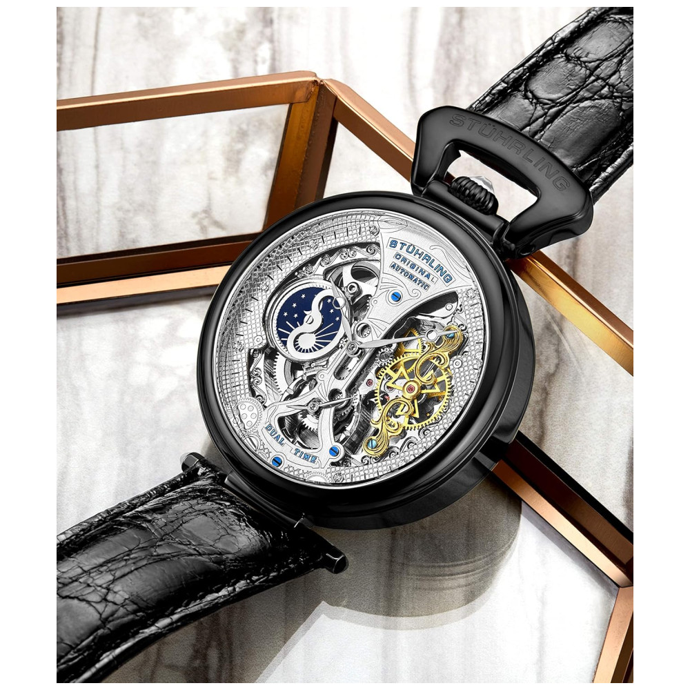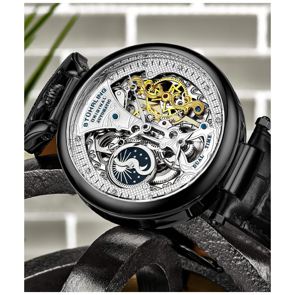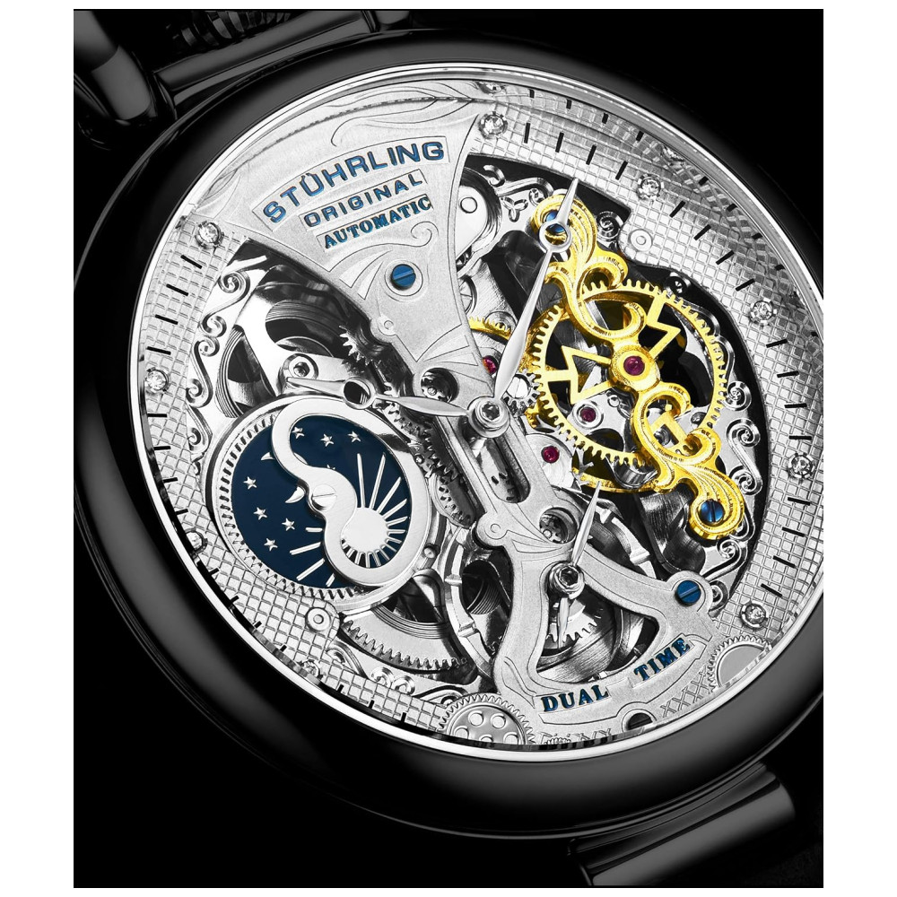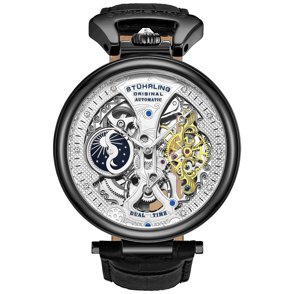 Relogio Homem Masc.Automático Couro Dual Time AM PM Sol Lua 50M Mergulho STUHRLING 3920.4 Preto