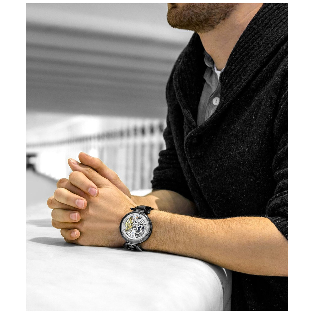 O mostrador com mecanismo aparente e transparente gravado permite que você assista em seu pulso, pois o mecanismo interno marca a passagem do tempo NENHUMA PILHA NECESSÁRIA O movimento mecânico automático de corda utiliza seus movimentos naturais para manter o relógio a funcionar enquanto o usar DUAL TIME AM PM Acompanhe 2 fusos horários distintos com o subdiretório GMT funcional. Acompanhe também noite e dia com Subdial Sol , Lua pulseira de couro SLEEK e acabamento com fivela de tang , abraça o seu pulso com conforto inigualável.