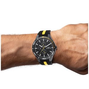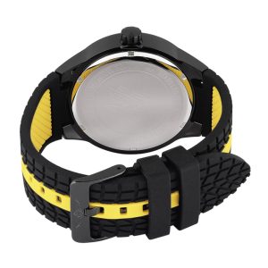 Apresentamos o Relógio Invicta Racing 47554, uma peça que combina estilo esportivo e precisão para o homem moderno. Este relógio possui uma caixa de 46 mm em aço inoxidável com acabamento preto, conferindo durabilidade e um visual arrojado. O mostrador preto em latão é protegido por um cristal mineral resistente, garantindo a integridade do visor. A pulseira em silicone nas cores amarela e preta oferece conforto e flexibilidade, ideal para o uso diário e atividades esportivas.