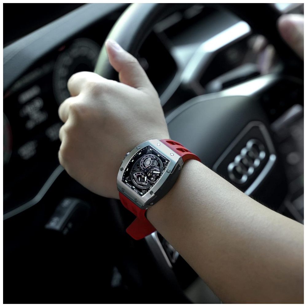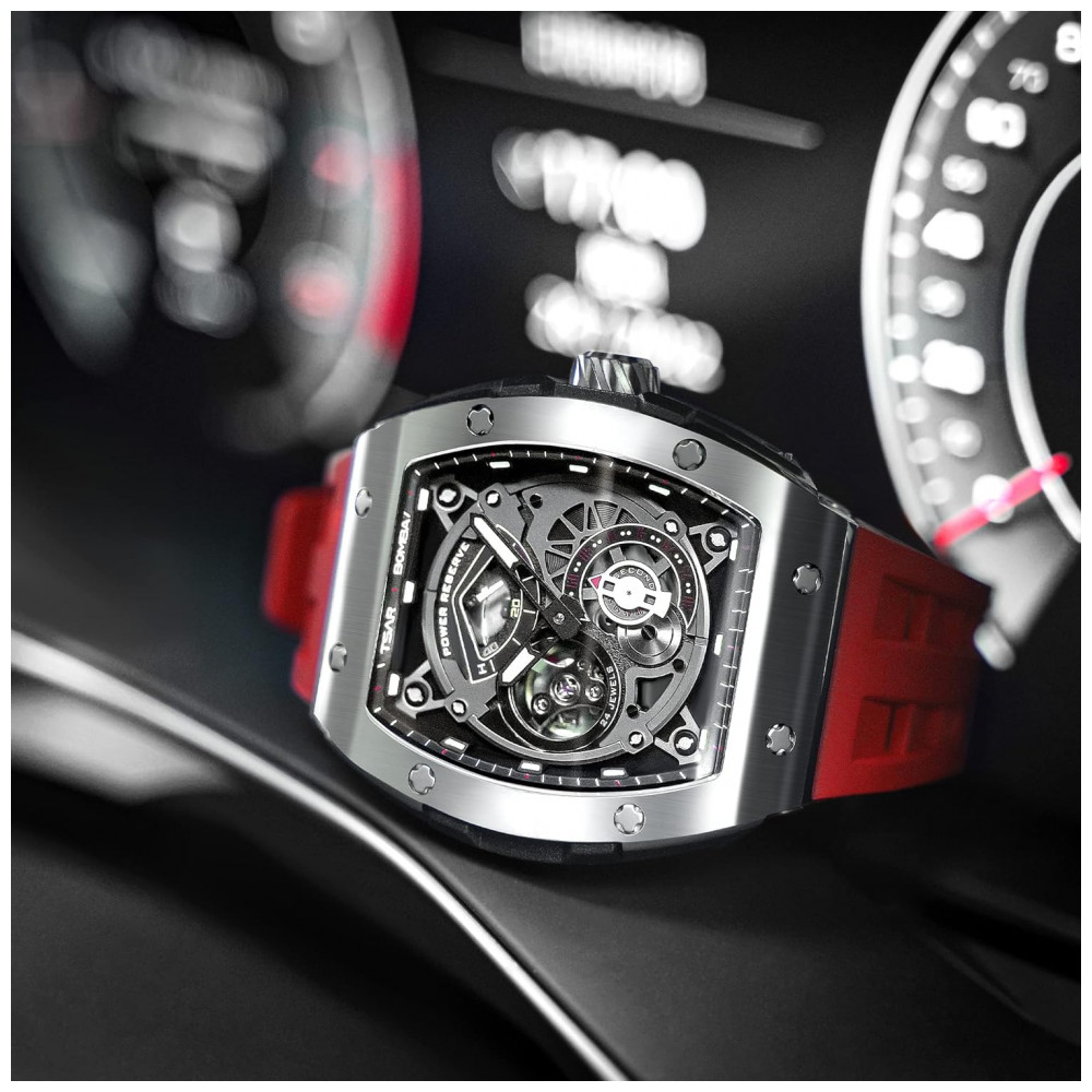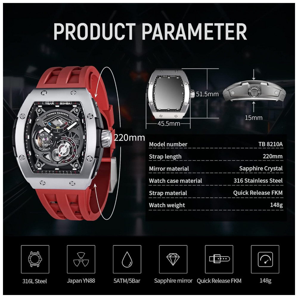 TSAR BOMBA Esportista A estética do percurso é interpretada e o espírito do atleta é infundido nele. A reserva de energia de 40 horas, seu fogo inextinguível de entusiasmo faz você assistir à corrida de longa distância com uma concentração de tirar o fôlego. O atleta seguirá o tempo com precisão intransigente após ser preenchido com energia. Com linhas compactas e transparência instantânea do relógio TB 8210, a aparência de cada ponte, cada linha e cada engrenagem deve ser impecável.