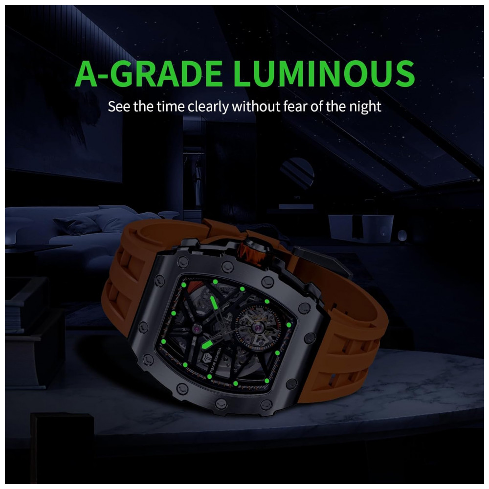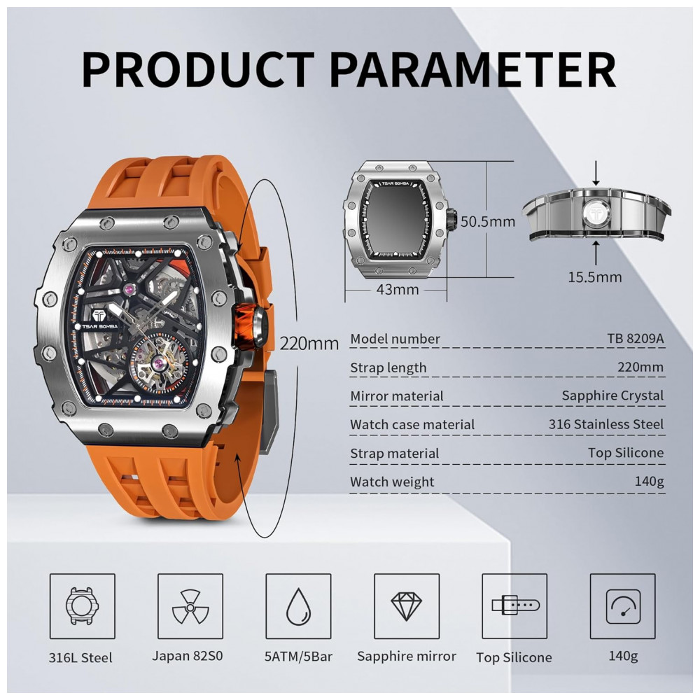 TSAR BOMBA 8209 STAR Guardian Existe um design de rede de estrelas ocas dentro, que simboliza a esperança dos guerreiros. Eles são guerreiros que sofreram centenas de batalhas. Série T 8209, nascida no Laboratório de Força Sino Alemão. É uma cristalização sutil do artesanato relojoeiro e materiais de alta tecnologia. Prêmio internacional de design em forma de barril, ajuste ergonômico. Com design oco de alta transparência e dupla face, permitindo que você tenha um senso de visão mecânico transparente e de alta definição.