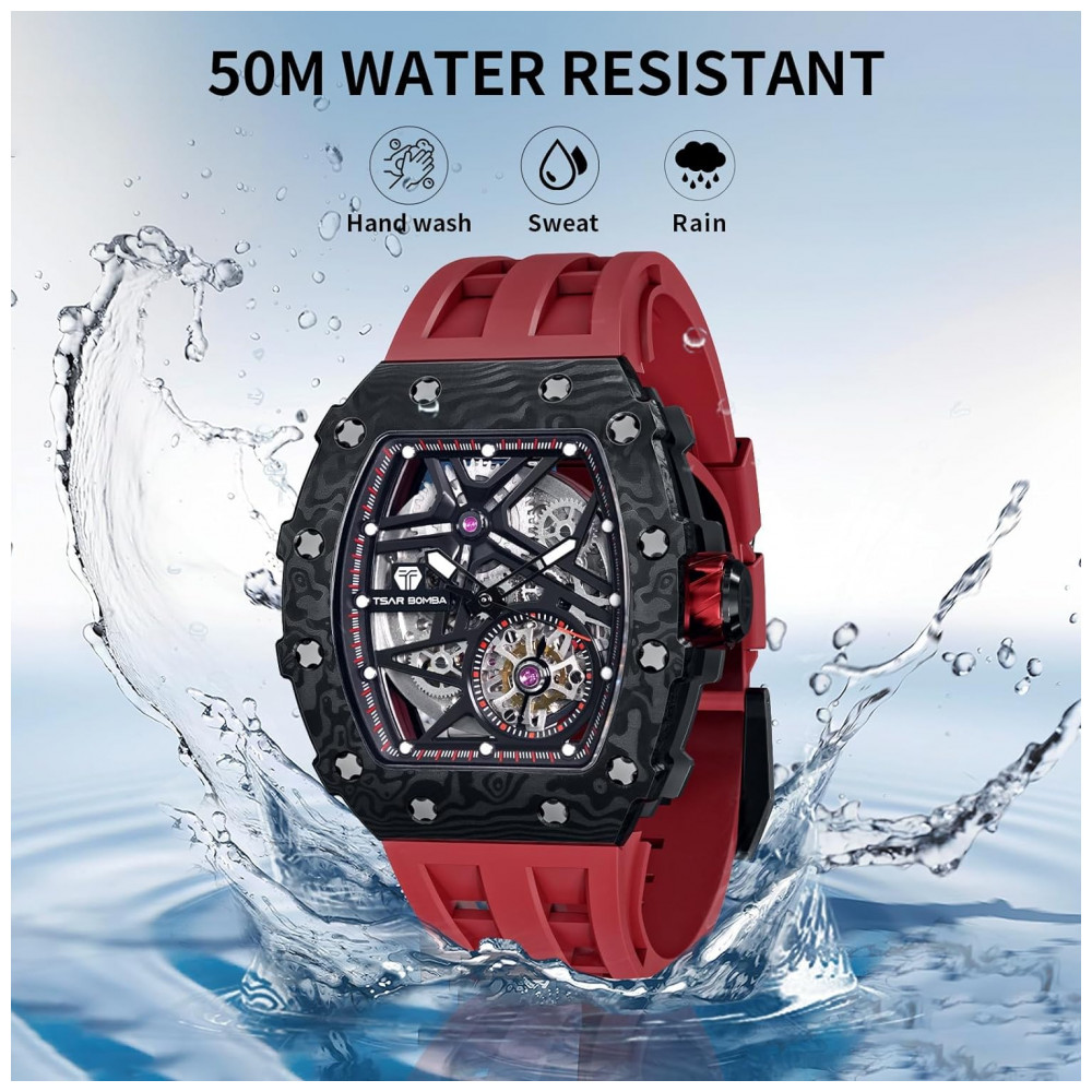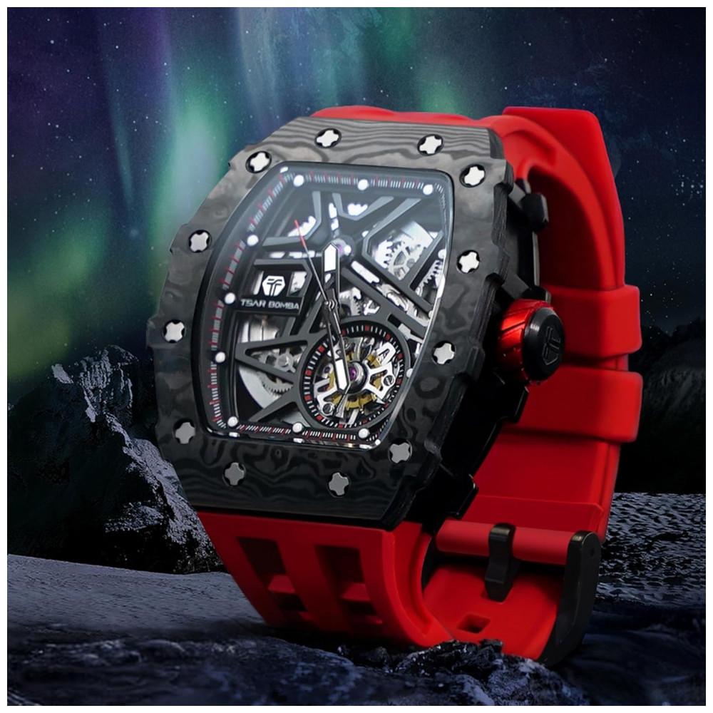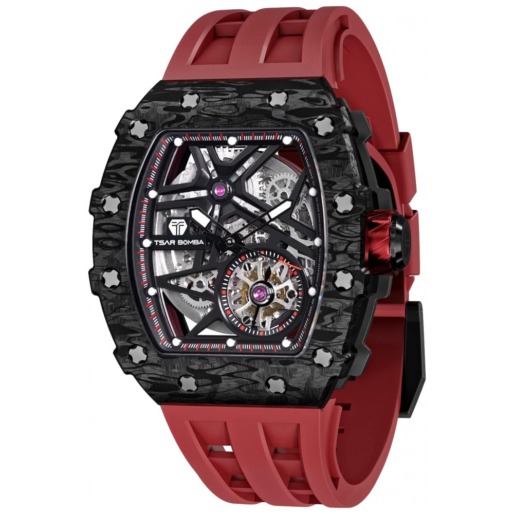 Relógio Masculino Analógico Automático a Prova dÁgua 50M com Pulseira de Silicone TSAR BOMBA TB 8209CF Vermelho e Preto