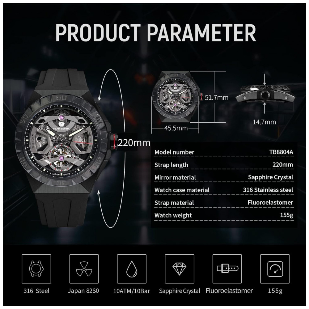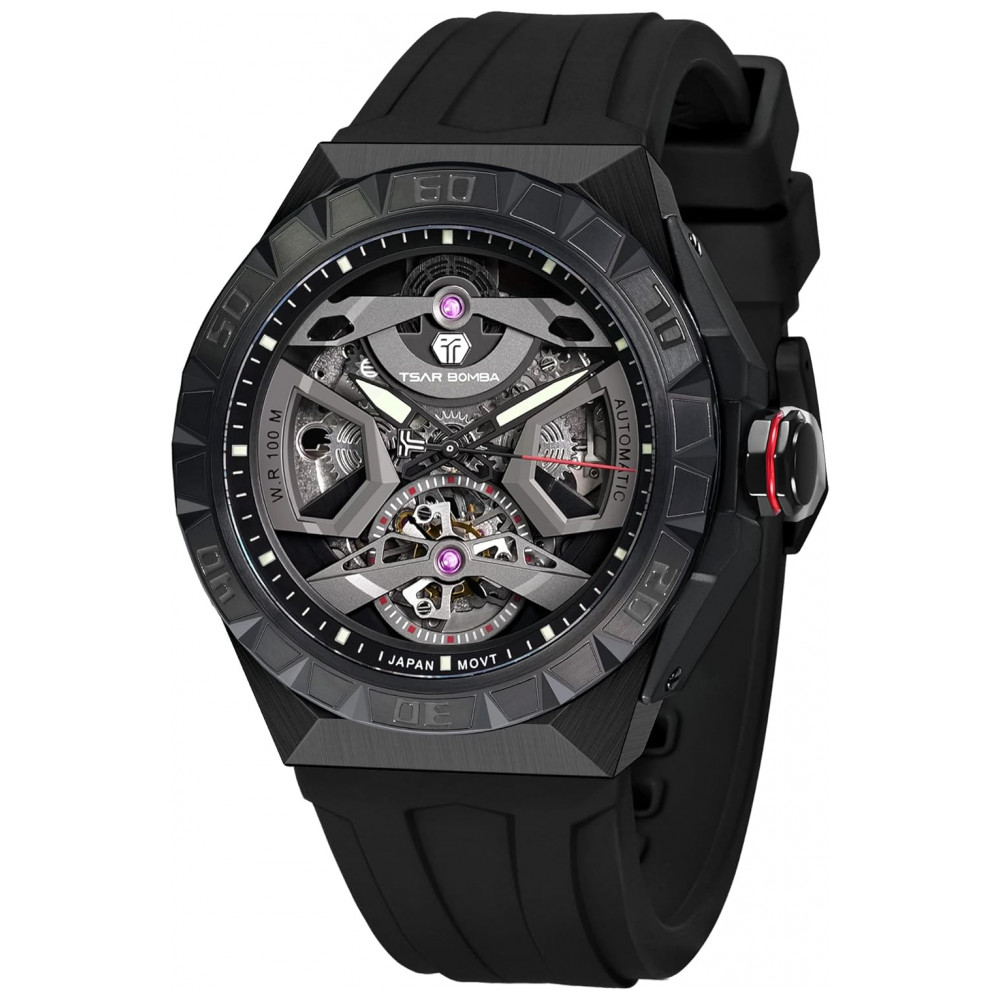 Relógio Masculino Analógico Automático Mecânico a Prova dÁgua 100M com Pulseira de Silicone TSAR BOMBA 8804 Preto