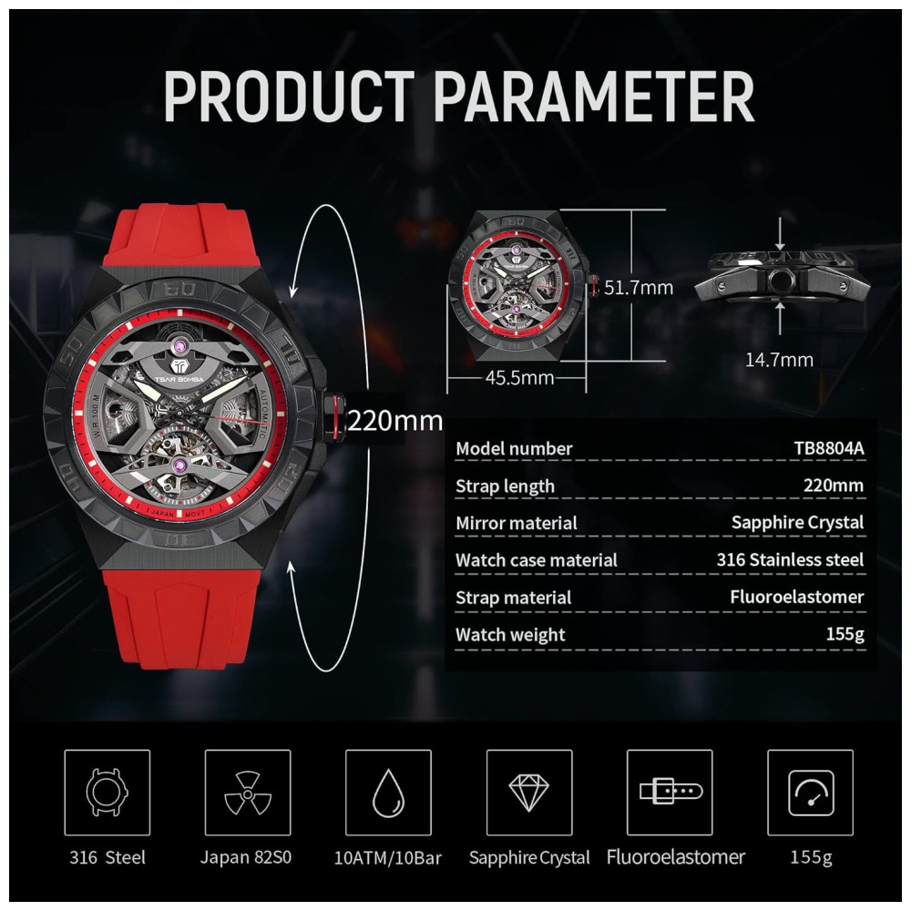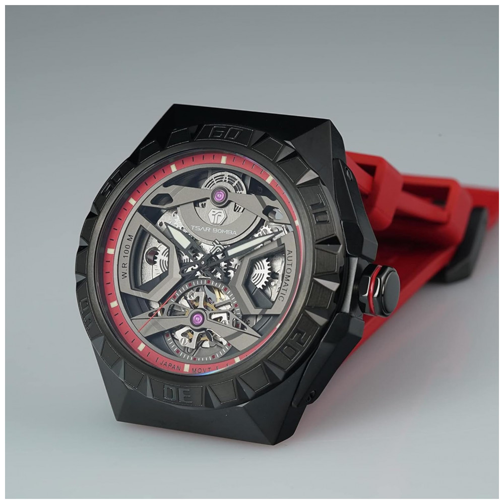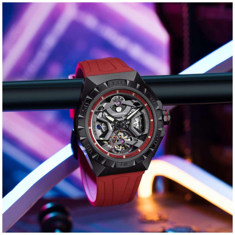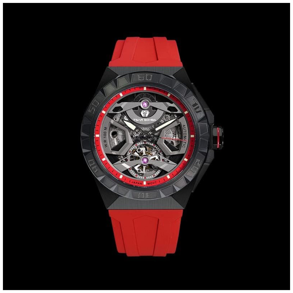Relógio Masculino Analógico Automático Mecânico a Prova dÁgua 100M com Pulseira de Silicone TSAR BOMBA SGLZTB8804 FR Vermelho
