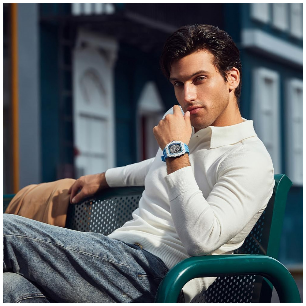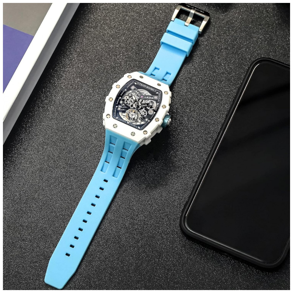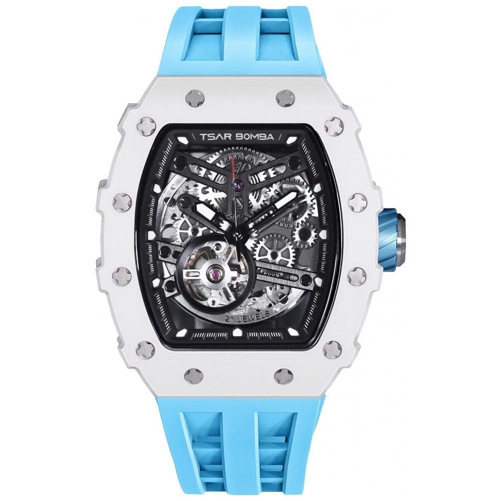 Relógio Masculino Analógico Automático Mecânico a Prova dÁgua 50M com Pulseira de Silicone TSAR BOMBA SGLZ TB 8208 Azul