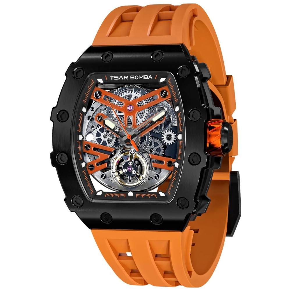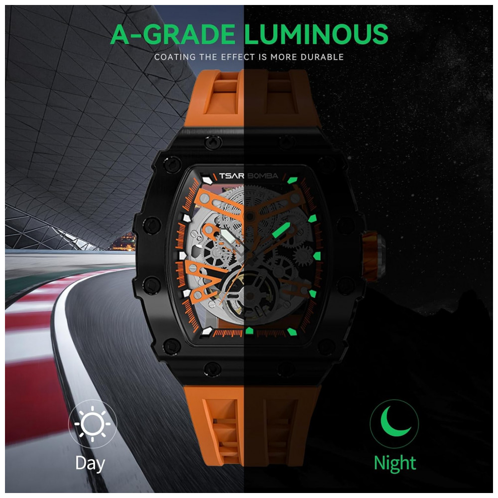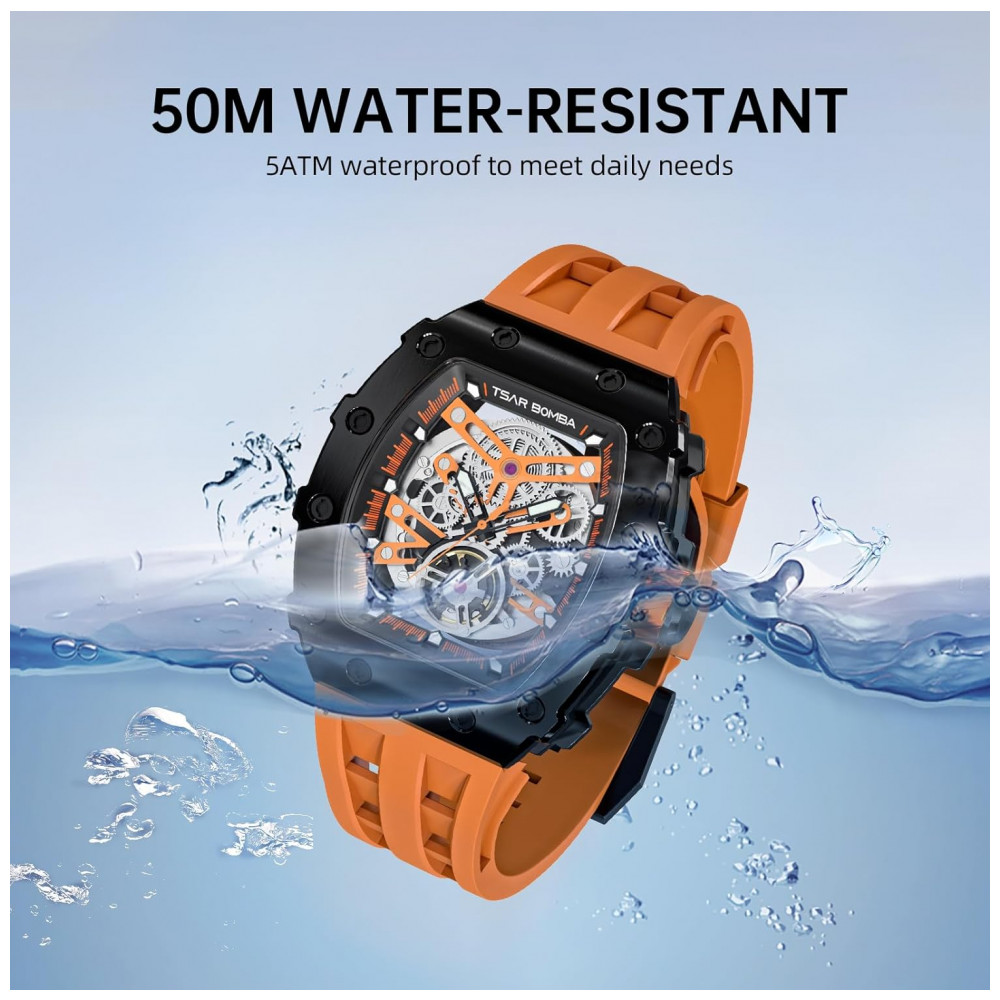 Relógio Masculino Analógico Automático Mecânico a Prova dÁgua 50M com Pulseira de Silicone TSAR BOMBA TB8208SGLZ Laranja