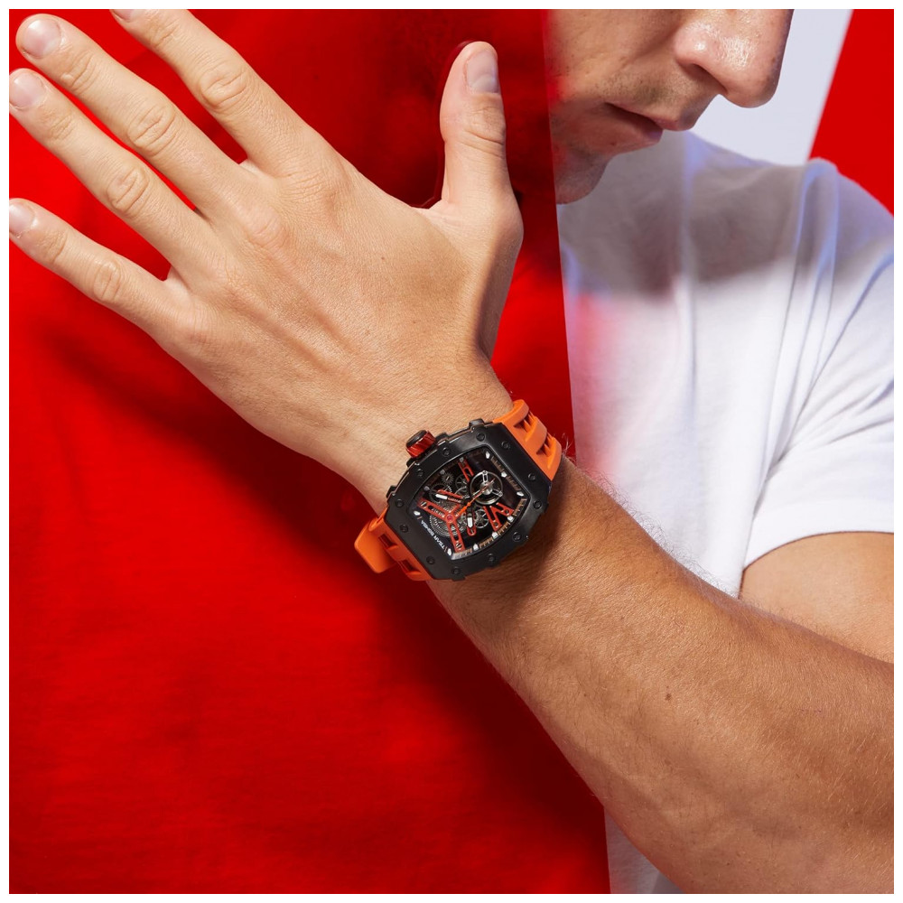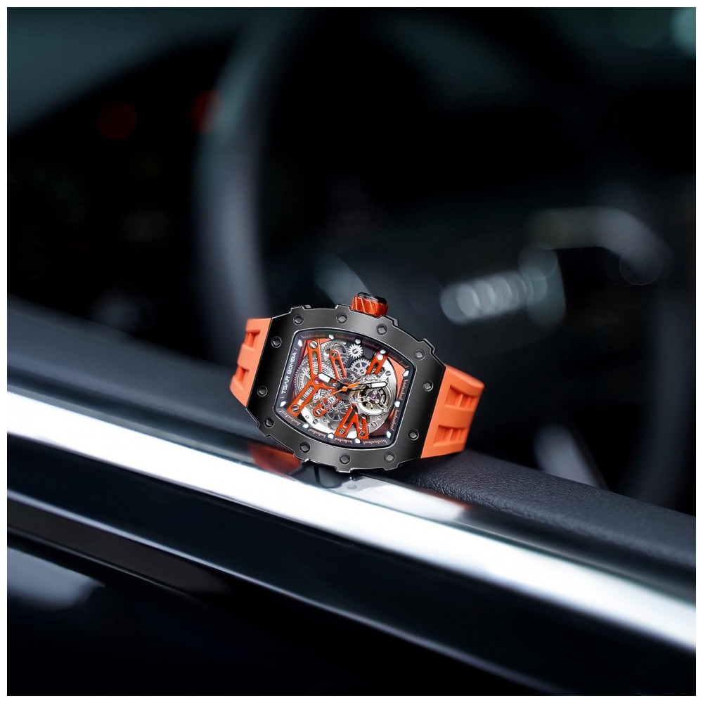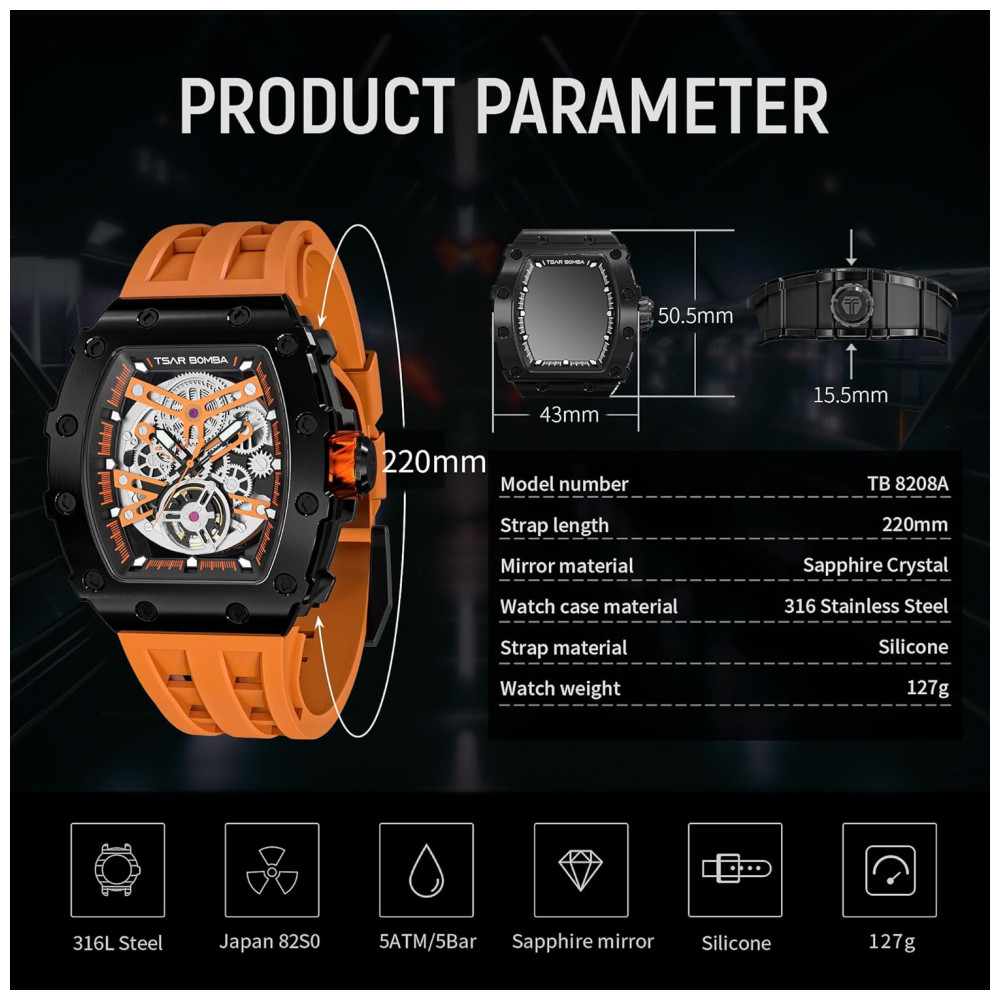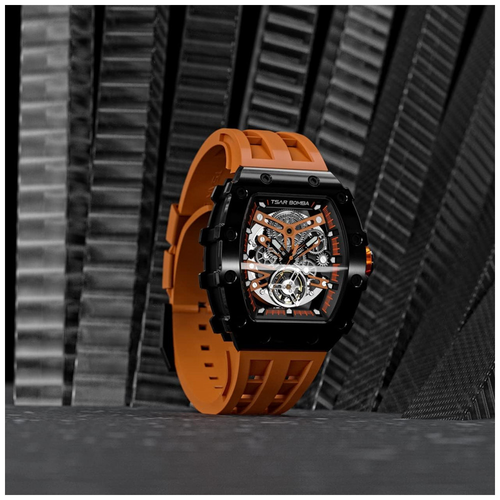 Relógio Masculino Analógico Automático Mecânico a Prova dÁgua 50M com Pulseira de Silicone TSAR BOMBA TB8208SGLZ Laranja