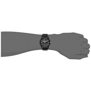 Mostrador preto com algarismos arábicos completos Janela de data às 3 horas horário militar 24 horas.