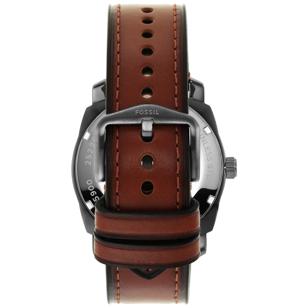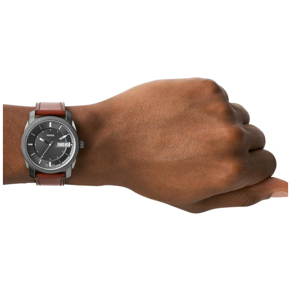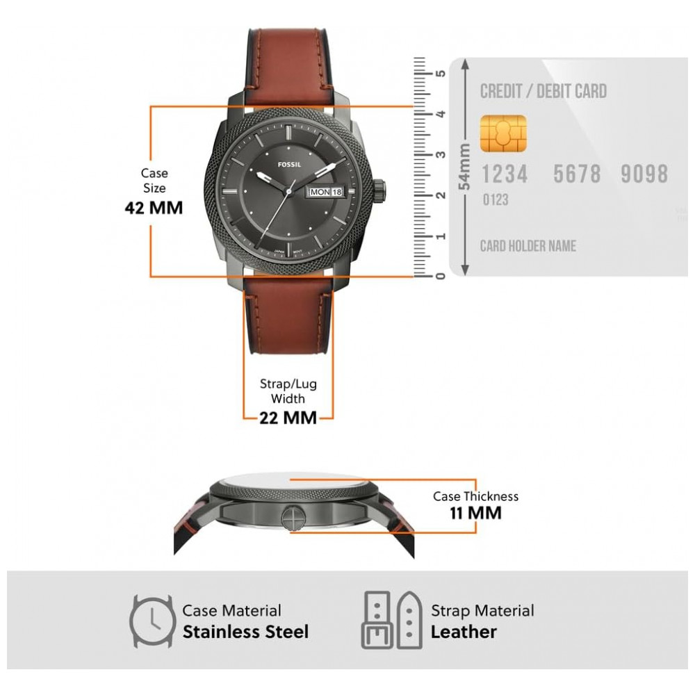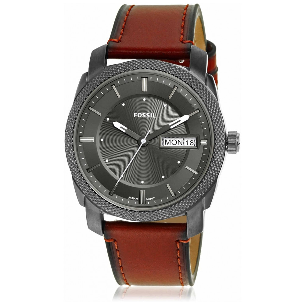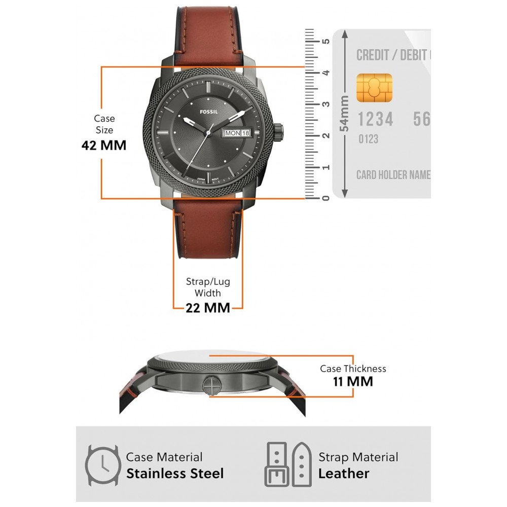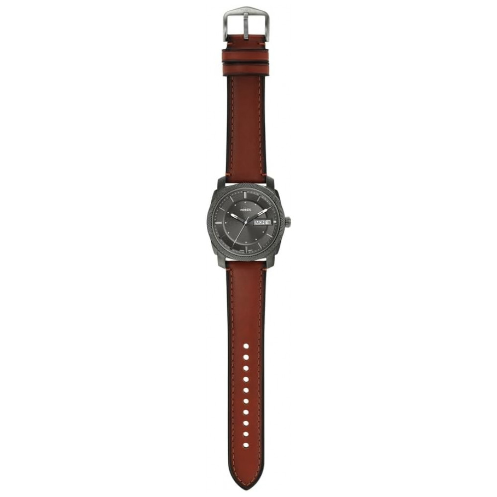 Caixa de aço inoxidável fumê com um raio de sol cinza e mostrador texturizado pulseira de couro ecológico marrom âmbar com fecho de fivela ajustável nosso couro ecológico usa um processo de curtimento eficiente em termos de recursos intercambiável com todas as pulseiras Fossil de .