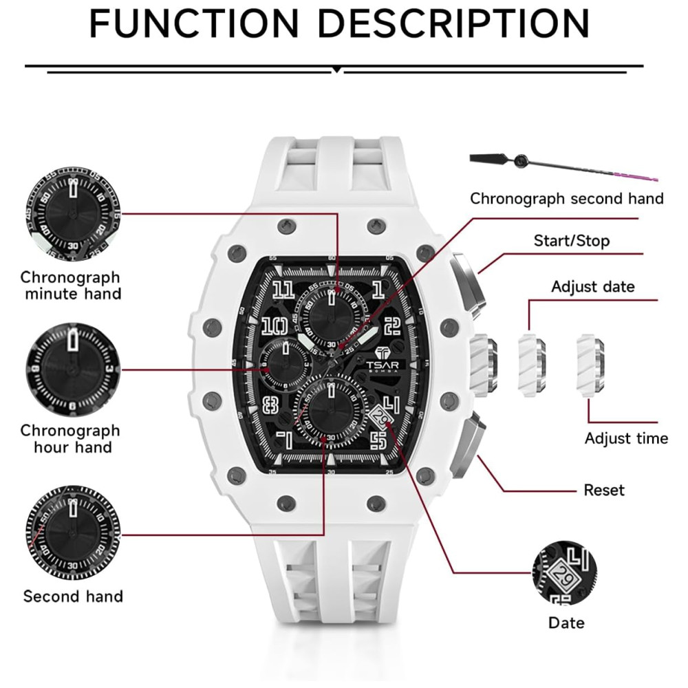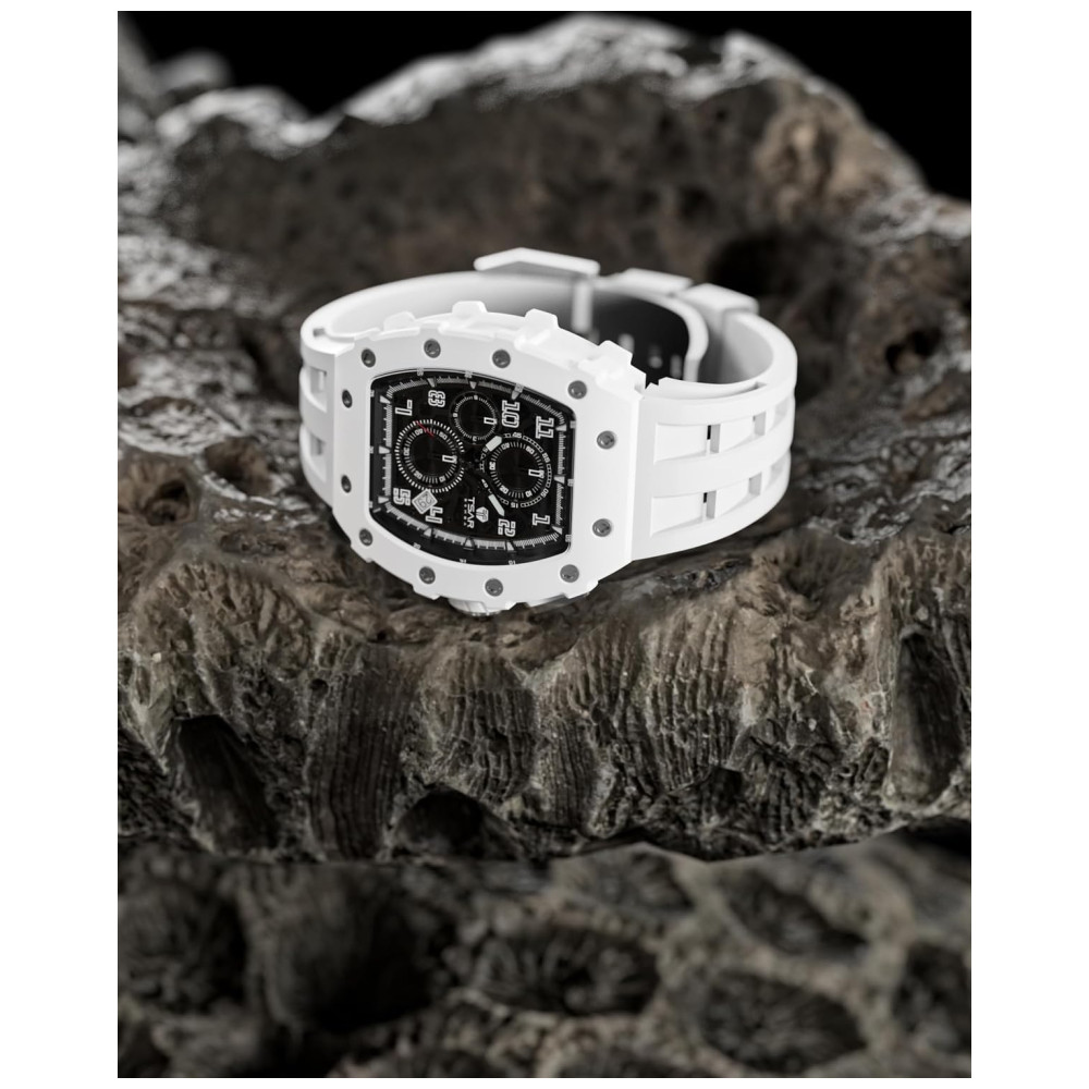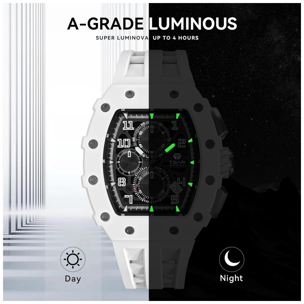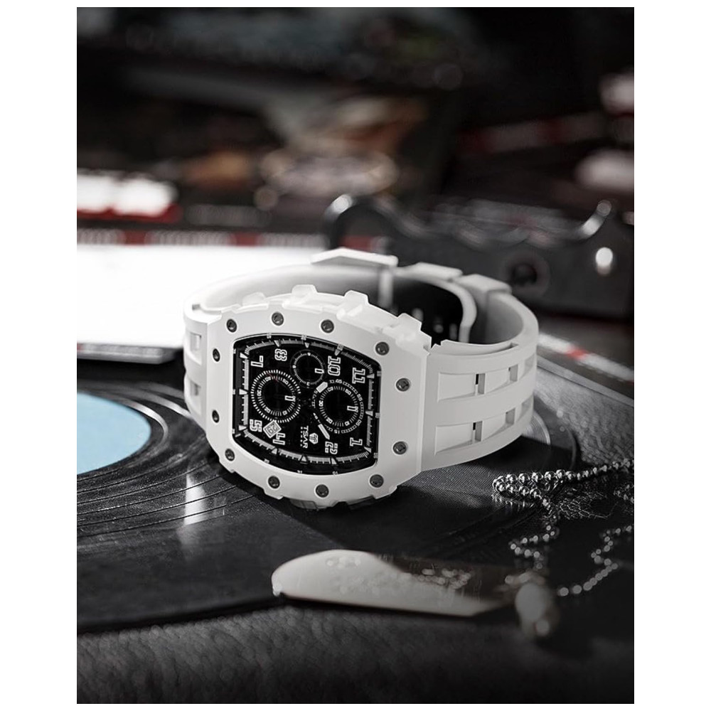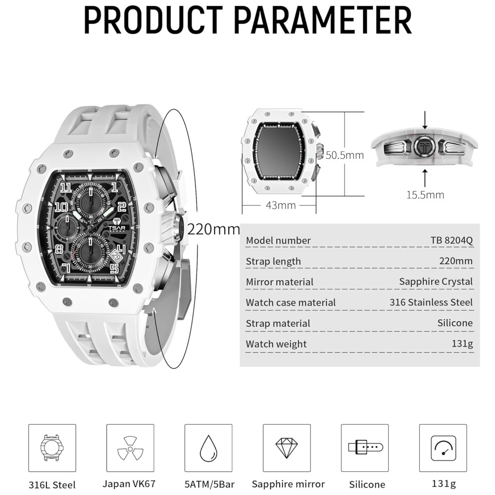 TSAR BOMBA é mais como um solo de música ambiente. Processo mais complexo, a face da caixa de aço é pulverizada com laca branca, repetidamente limpa e cuidadosamente acabada para que qualquer peça conectada à caixa esteja funcionando perfeitamente como deveria. materiais. Uma festa visual de luxo simples que traz o melhor do estilo masculino.