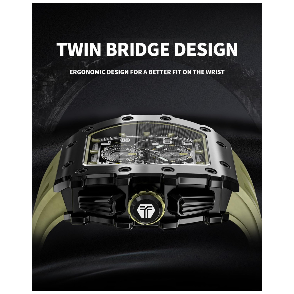DESIGN ERGONÔMICO DE PONTE DUPLA O relógio TSAR BOMBA nasceu no laboratório de força sino alemão. Com base na mecânica mecânica, materiais inovadores e fabricação de precisão, integra a estética oriental e se esforça para fazer avanços contínuos em tecnologia. Adota um design ergonômico de ponte dupla. Cada caixa passou por 202 processos para tornar o relógio mais adequado ao pulso humano, aprimorando muito a experiência de combinação. Um banquete visual de luxo simples que traz à tona o melhor do estilo masculino.