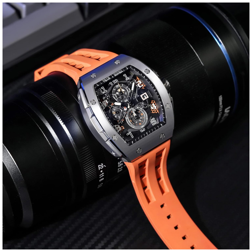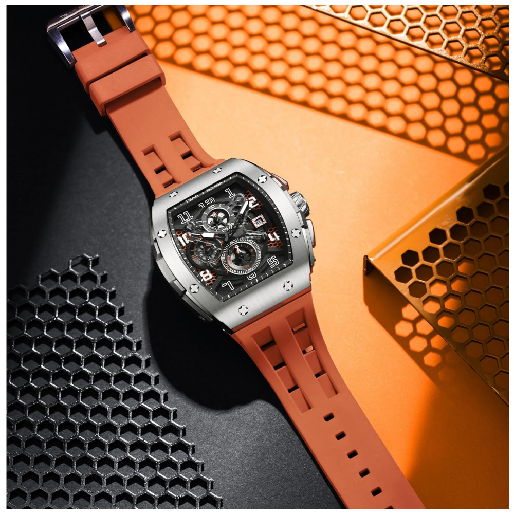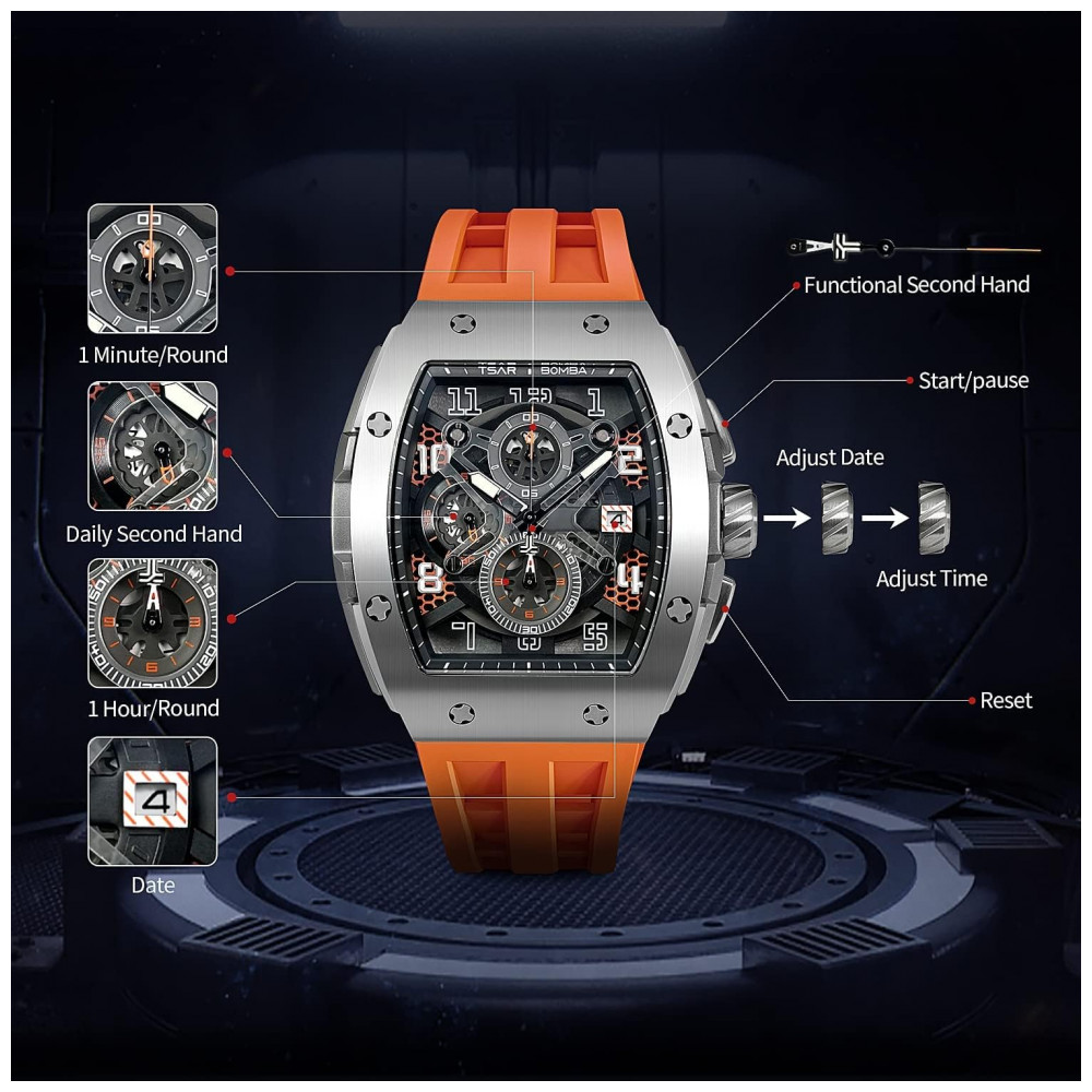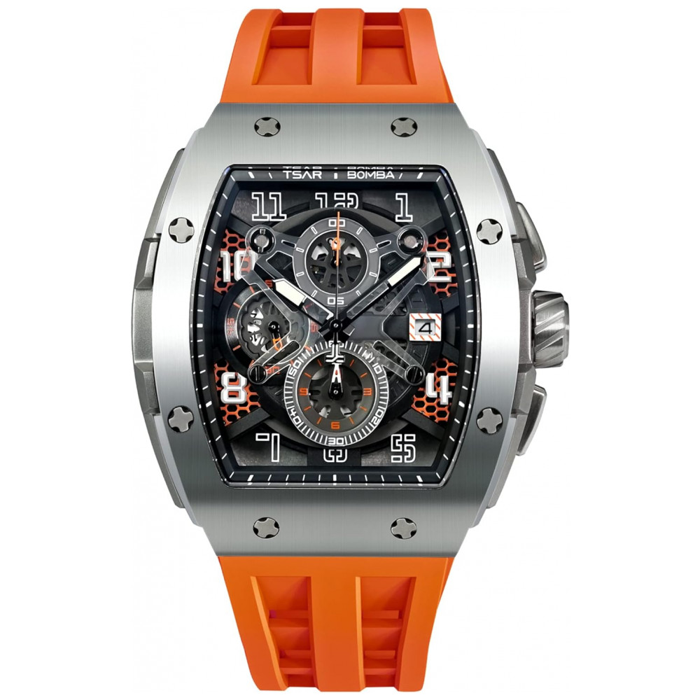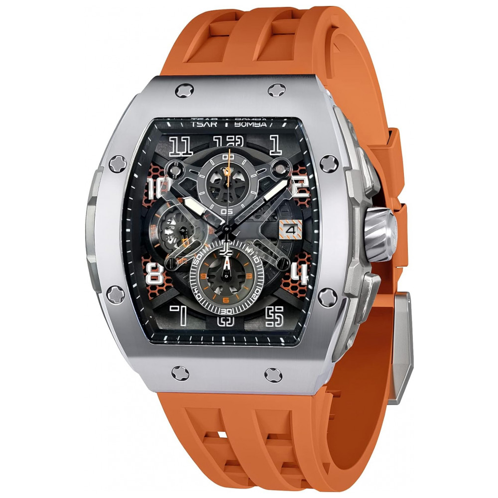 Relógio Masculino Analógico Quartzo a Prova dÁgua 50M com Cronógrafo TSAR BOMBA TB 8211 Laranja e Prata