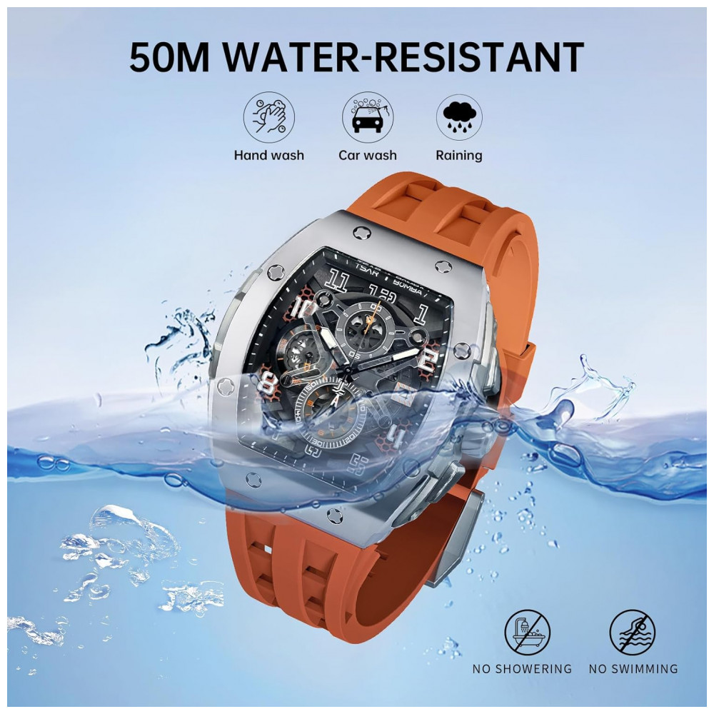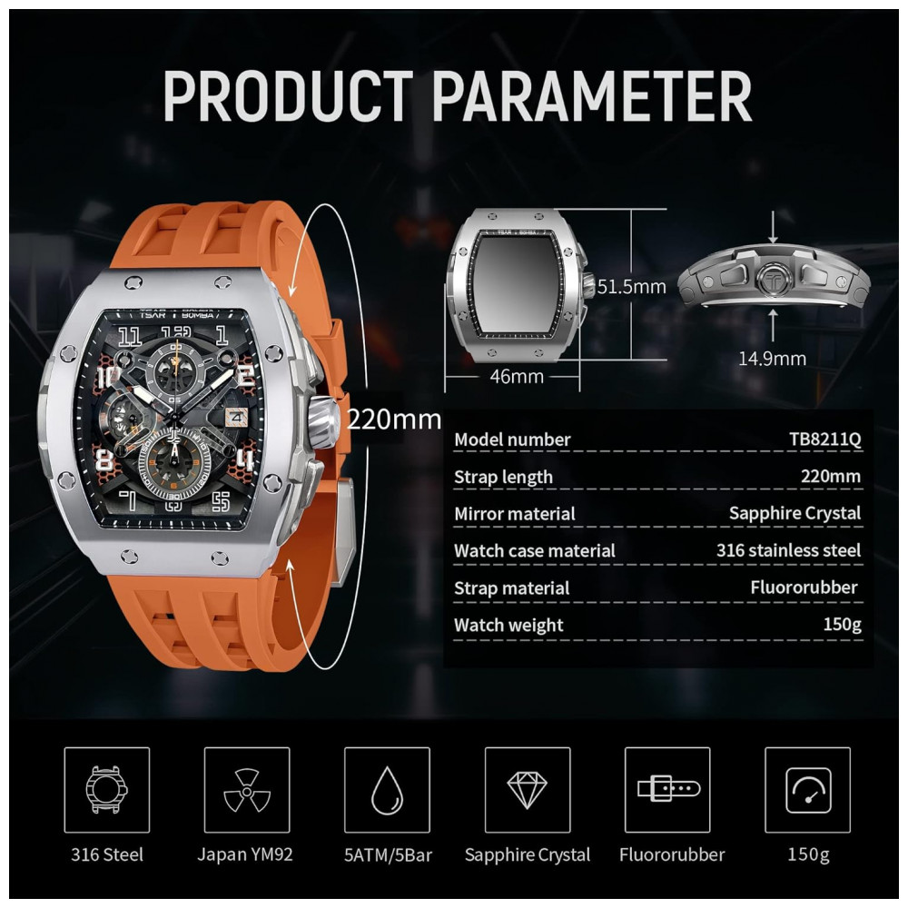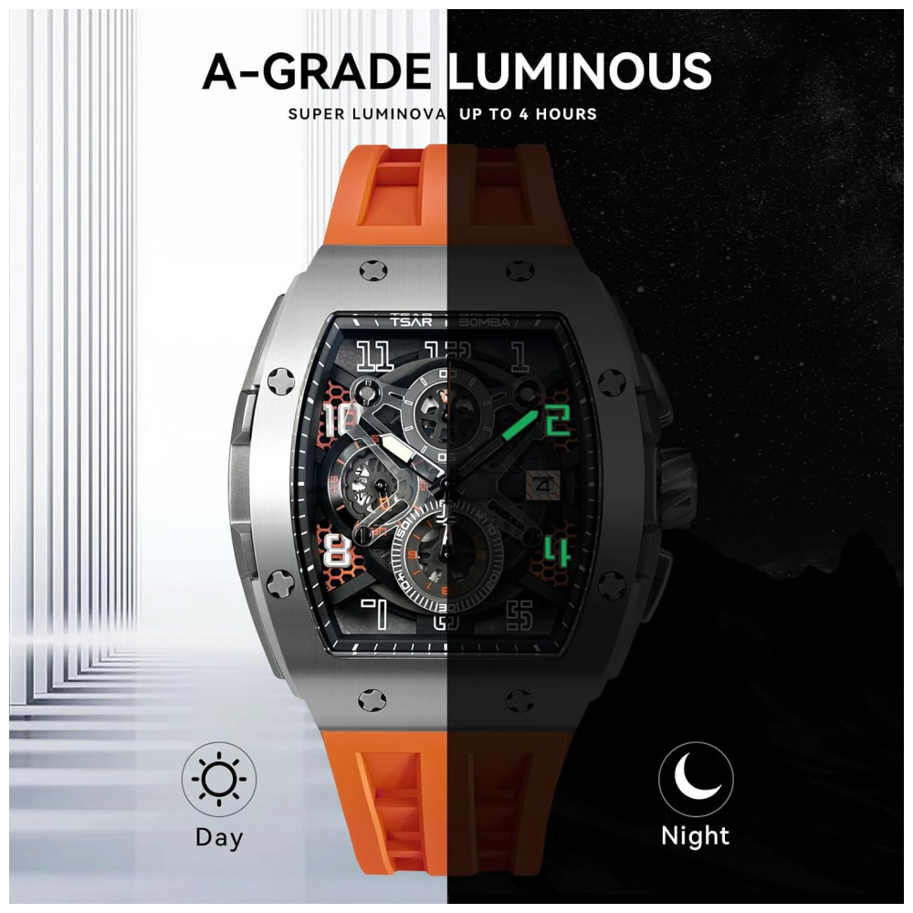 TSAR BOMBA X A interpretação de X, percebe o amor, a sensação de poder é inerente e a inovação está transbordando com estilo chique. A textura de prensagem de óleo da individualidade, rompendo os limites dos relógios de precisão e sentindo novas expectativas para o futuro. 202 procedimentos de processamento requintado, combinando artesanato estético puro e design clássico, enfatizando o retorno ao básico e rastreando a origem, cada aparência será uma experiência extraordinária. Fluorelastômero de liberação rápida Um grau luminoso Continue a explorar e inovar, atualize o uso da pulseira de fluoroelastômero de liberação rápida, pulso adequado, confortável de usar, resistência a altas temperaturas, anti oxidação, resistência a óleo, mais durável. A alça pode ser facilmente substituída por um puxão e um slide. Upgrade Um grau luminoso, torne se o guardião da noite, forneça lhe tempo preciso. 50M à prova dágua, o relógio pode ser para água fria, chuva. Função de cronógrafo multifuncional de cristal de safira Cristal de safira altamente translúcido com revestimento antirreflexo incolor, revestimento de alta tecnologia banhado a íon IP de grau de aviação com tecnologia de corte CNC de ultra precisão, aço inoxidável 316L resistente ao desgaste, processo de retificação a frio de diamante quádruplo para maximizar o atrito e a resistência à corrosão. O contador de segundos do cronógrafo versátil com movimento japonês importado registra cada minuto com precisão para você. Presente Perfeito TSAR BOMBA é adequado para qualquer ocasião.