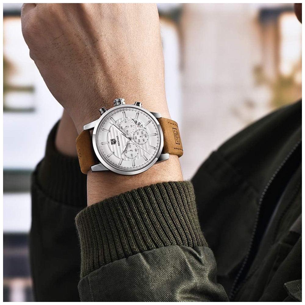 FAIXA DE COURO DE QUALIDADE Vidro mineral à prova de arranhões, pulseira de couro traz uma experiência de uso confortável e cavalheiro.