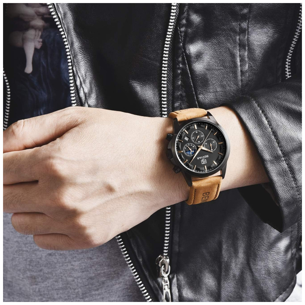 PRESENTE PERFEITO Relógios de pulso para homens são o presente perfeito para festivais, família e reuniões. Os relógios de couro são o presente luxuoso da moda para a formatura, aniversário, casamento e dia dos namorados. Os relógios cronógrafos analógicos são os presentes ideais para o pai, o namorado ou outros colegas e colegas do sexo masculino. Com certeza conquistará o coração de seus amigos e familiares