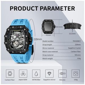 Técnico de Fibra de Carbono Importado Nascido no Laboratório Sino German Force. Com base na mecânica mecânica, materiais inovadores e fabricação de precisão, integra a estética oriental e se esforça para fazer avanços contínuos em tecnologia. Adota um design ergonômico de ponte dupla. Com estrutura de material rígido de grau aeroespacial mais leve de fibra de carbono que garante resistência ideal ao choque. Cada caixa passou por 202 processos para tornar o relógio mais adequado ao pulso humano, aprimorando muito a experiência de correspondência. Cristal de safira Aço inoxidável 316L Equipado com uma superfície de espelho de safira de revestimento antirreflexo incolor, resistente ao desgaste, altamente translúcido. A safira tem um nível de dureza Mohs de 9 devido ao processo de moagem a frio que é quatro vezes mais caro que o processo tradicional de dobra a quente, tornando a mais forte do que qualquer outro material natural, exceto diamantes. Com aço inoxidável 316L, a caixa é resistente à água e resistente à corrosão. Japanese Movement Nice Gift Fornece um tempo preciso e um zenamento de energia por mais de 48 horas. O mostrador esqueletizado funciona para dar a você uma visão direta do movimento, tudo em detalhes impressionantes. ou um aniversário, aniversário, casamento. Este relógio autêntico oferece uma experiência e visual brilhantes. Um bom relógio é reflexo da busca constante pela qualidade, TSAR BOMBA é o presente perfeito para um ente querido ou para você mesmo. WATERPROOF 5ATM UM NÍVEL SUPER LUMINOSO À prova dágua até 50 metros, o 8208 pode ser para água fria, chuva e natação. Resistência à água fácil de manusear em todas as situações da vida, não há necessidade de enfrentar o ambiente diário de água com cuidado. Um nível Super luminoso, permitindo que você leia o tempo no escuro. Cheio de energia brilhante, pode brilhar até 4 horas. A pulseira de silicone de de alta qualidade é resistente ao suor, umidade e corrosão e confortável de usar sem qualquer reação alérgica.