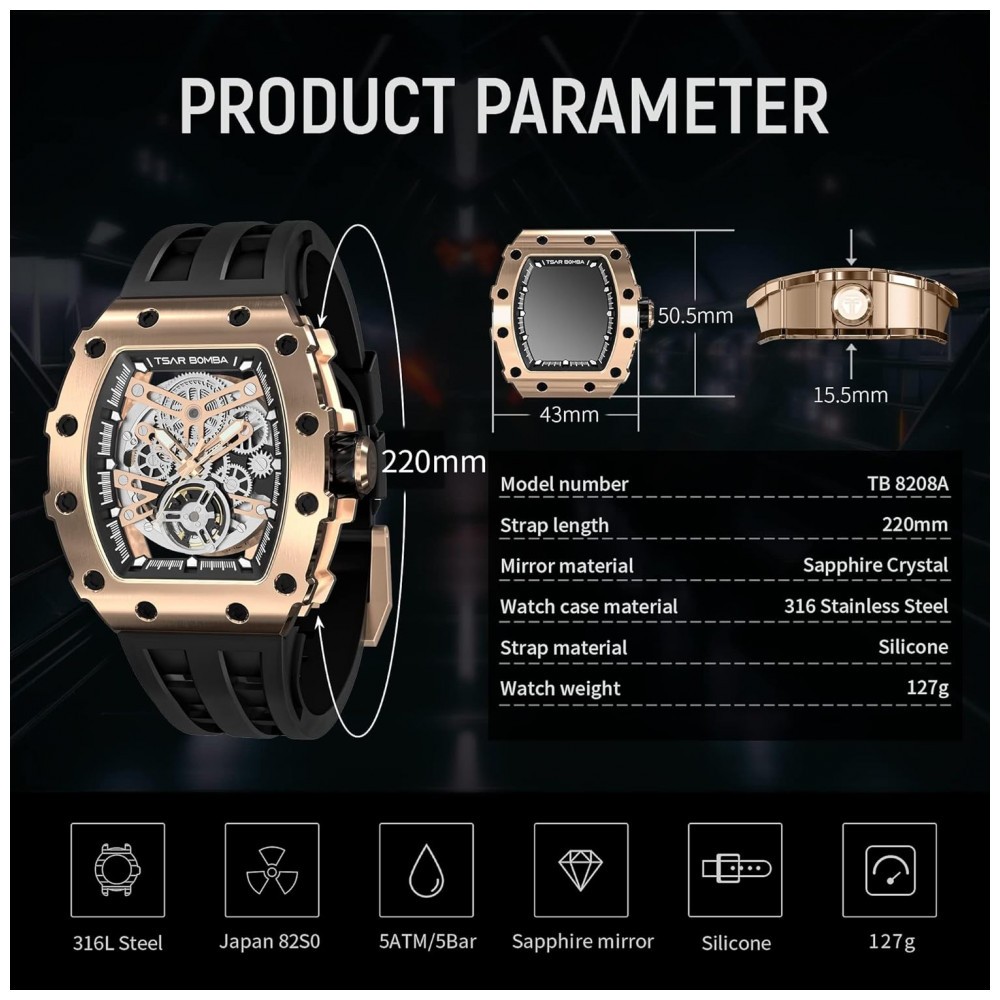 Movimento japonês e excelente presente Com movimento japonês, esses relógios oferecem precisão no tempo e uma reserva de energia de 48 horas. O mostrador esqueletizado revela o movimento interno em detalhes impressionantes. Seja para o Dia dos Pais, Natal, Dia de Ação de Graças, Dia dos Namorados, aniversário ou casamento, esses relógios autênticos proporcionam uma experiência e um visual brilhantes. Um bom relógio reflete a busca constante pela qualidade, e o TSAR BOMBA é o presente perfeito para entes queridos ou para si mesmo.