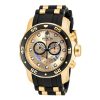 Este impressionante relógio Invicta Pro Diver apresenta um movimento automático preciso, bem como uma caixa de aço dourada. Seu mostrador de metal azul é envolto por um Cristal Mineral altamente protetor. Este relógio é finalizado por uma forte pulseira de aço, ouro e aço inoxidável e oferece resistência à água de 200 m.