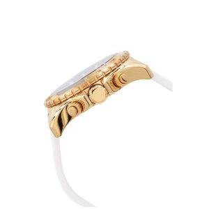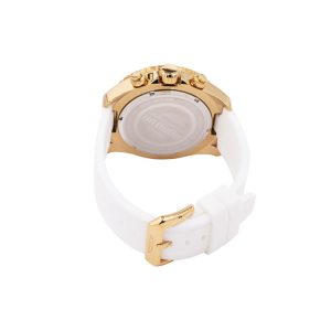 Este incrível relógio Invicta da coleção Aviator oferece um movimento de quartzo exato, com uma caixa de ouro incrível. O mostrador exibe um mostrador de metal azul protegido por nosso exclusivo Flame Fusion Crystal. O design é completado por uma pulseira de silicone branca. Este relógio pode resistir à água por até 100 m.