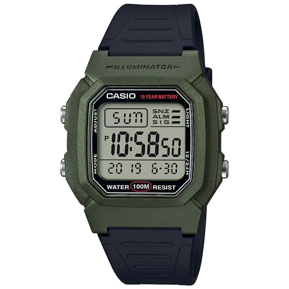O relógio desportivo digital clássico masculino da Casio apresenta um design intuitivo que o torna fácil de usar para atletas em movimento. O relógio é construído com uma caixa de resina durável, uma moldura de resina verde estacionária e uma pulseira de resina preta com um fecho de fivela ajustável. Uma janela de mineral durável protege a face quadrada do mostrador digital cinza, que apresenta um display digital de hora junto com o dia, a data e o mês. O relógio também inclui botões de luz, modo e ajuste que permitem que você personalize o visor do relógio para se adequar ao seu treino. O relógio movido a quartzo digital é resistente à água até 330 pés.