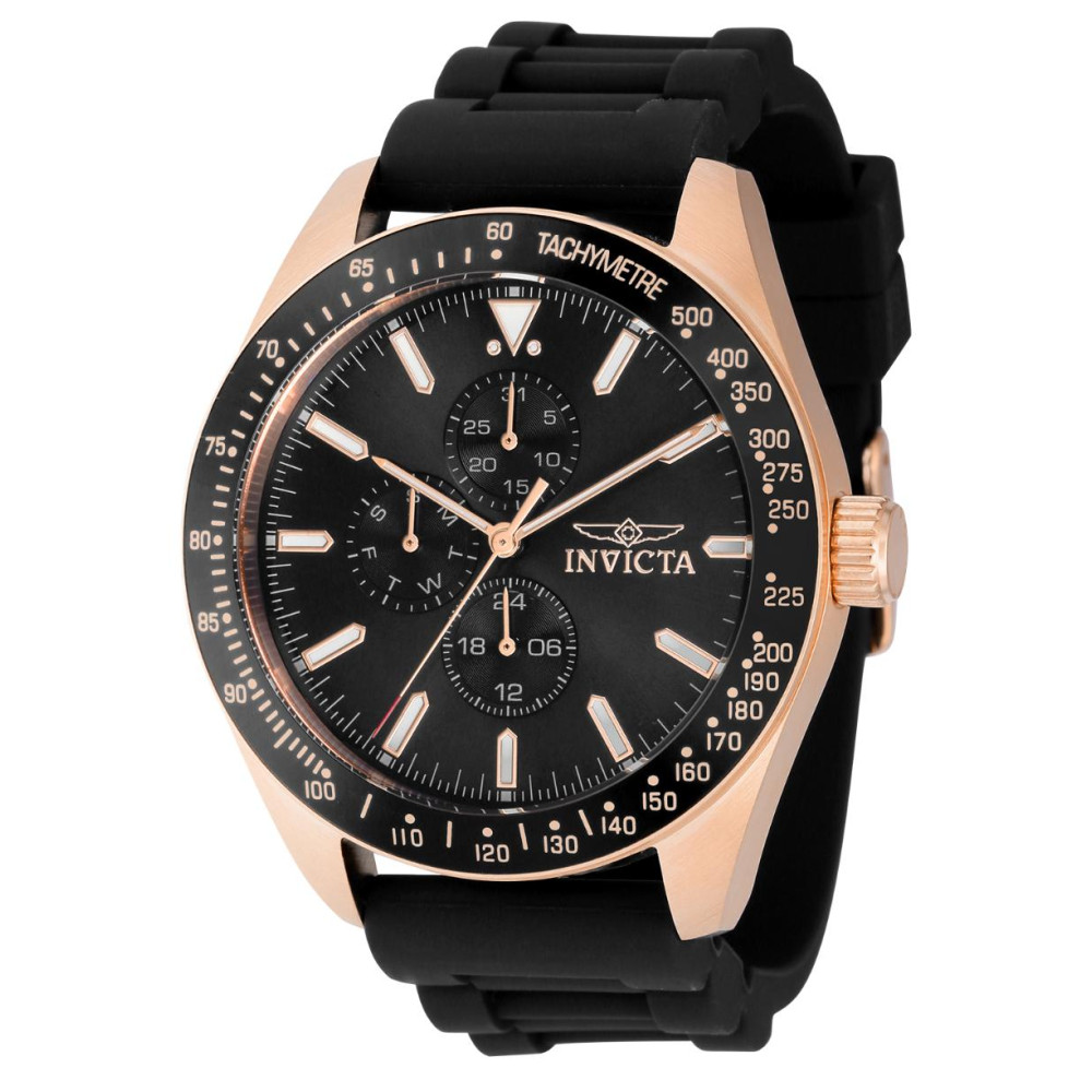 Este atraente relógio Invicta da coleção Aviator é alimentado por um movimento preciso de quartzo, com uma caixa de ouro rosa. Seu rosto é decorado com um mostrador preto de metal e protegido por um robusto cristal de fusão de chamas. Uma banda de silicone preta completa este relógio que pode resistir à água por até 100 m.