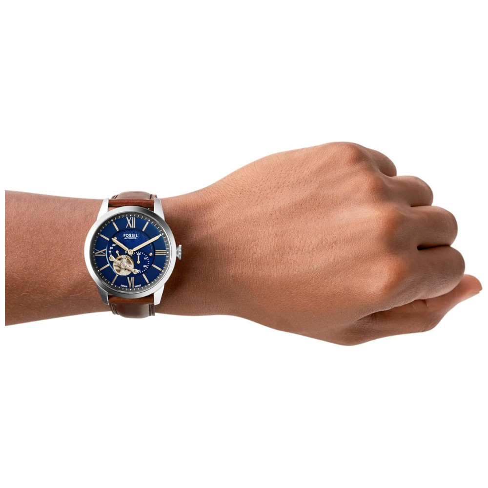 Caixa de aço inoxidável com mostrador azul pulseira de couro marrom com fecho de fivela intercambiável com todas as pulseiras de relógio fóssil de