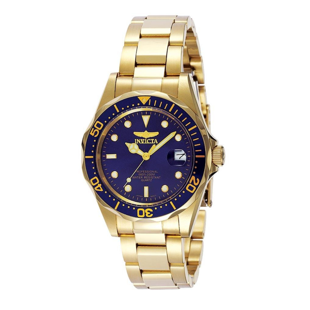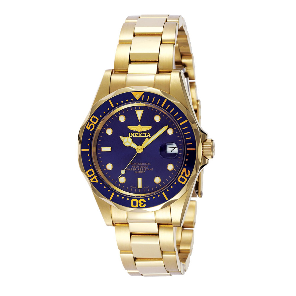 Este atraente relógio Invicta da coleção Pro Diver é alimentado por um movimento de quartzo preciso, com uma caixa dourada. Seu mostrador é decorado por um mostrador de metal azul e protegido por um resistente Cristal Mineral. Uma pulseira de aço inoxidável dourada completa este relógio que pode resistir à água por até 200 m.
