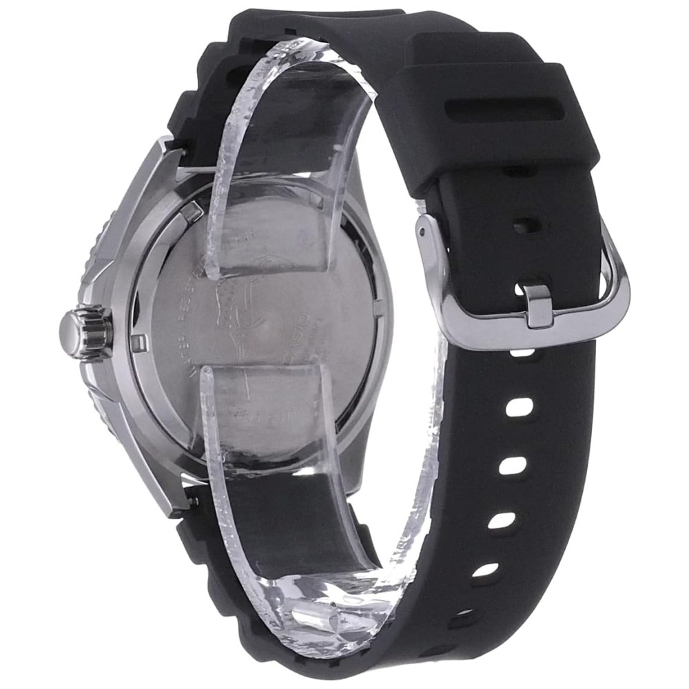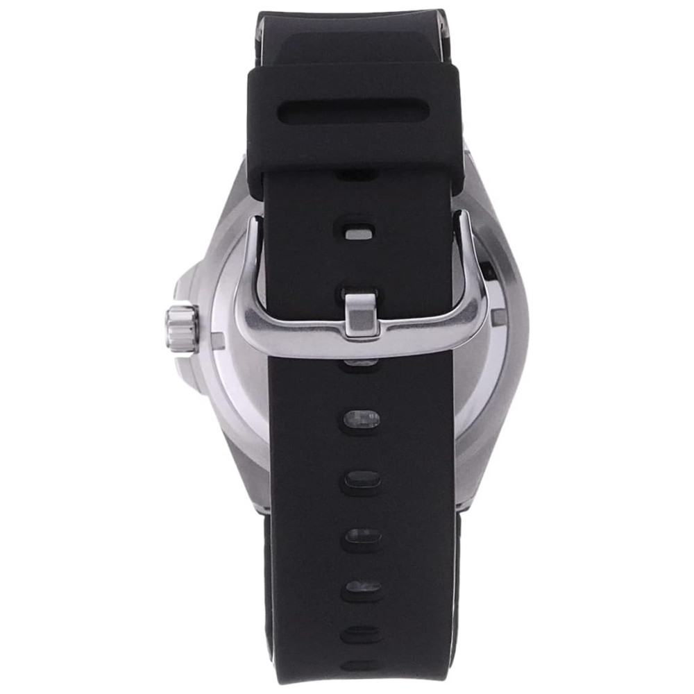 Inspirado no mar, esta pulseira de resina preta e caixa de aço inoxidável conferem lhe um aspecto clássico. Simples analógico de 3 ponteiros com indicação de data para uma leitura fácil. A pulseira de resina preta do relógio e a caixa de aço inoxidável conferem lhe um aspecto clássico enquanto a sua a moldura anti reversa adiciona um visual inspirado pelo mergulhador. Simples analógico de 3 mãos com exibição de data para uma leitura fácil.