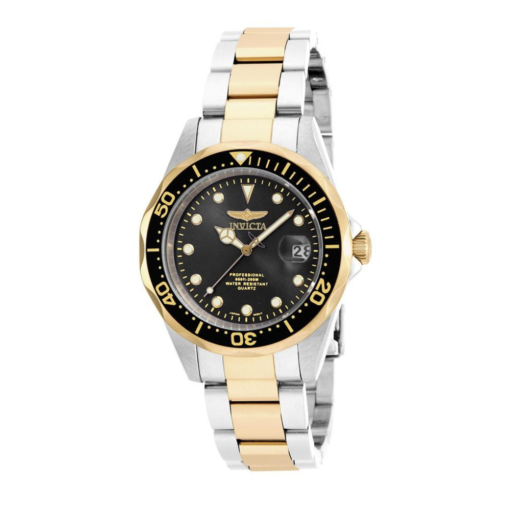 Este atraente relógio Invicta da coleção Pro Diver é alimentado por um movimento de quartzo preciso, com uma caixa de aço dourada. Seu mostrador é decorado por um mostrador de metal preto e protegido por um resistente Cristal Mineral. Uma pulseira de aço, ouro e aço inoxidável completa este relógio que pode resistir à água por até 200 m.