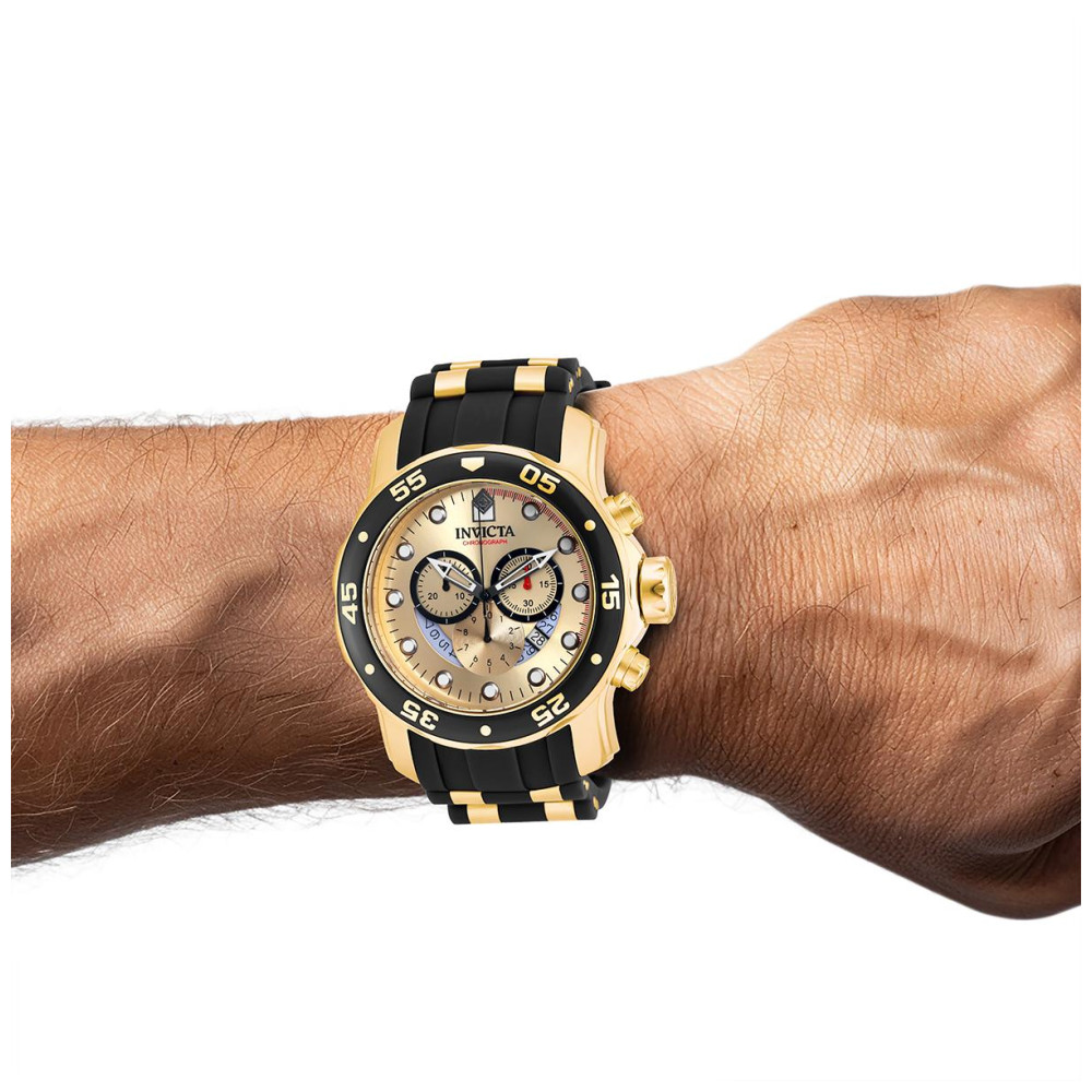 Este atraente relógio Invicta da coleção Pro Diver é alimentado por um movimento de quartzo preciso, com uma caixa dourada. Seu mostrador é decorado por um mostrador de metal dourado e protegido por um resistente Flame Fusion Crystal. Uma pulseira de ouro, preto, aço inoxidável e silicone completa este relógio que pode resistir à água por até 100 m.