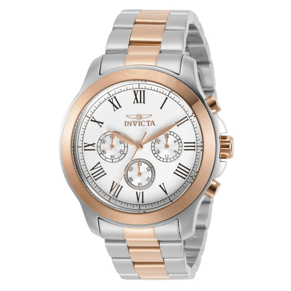 Este impressionante relógio Invicta Specialty apresenta um movimento de quartzo preciso, bem como uma caixa de aço. Seu mostrador de metal prateado é envolto por um Cristal Flame Fusion altamente protetor. Este relógio é finalizado com uma pulseira de aço resistente, ouro rosa e aço inoxidável e oferece resistência à água de 100 m.