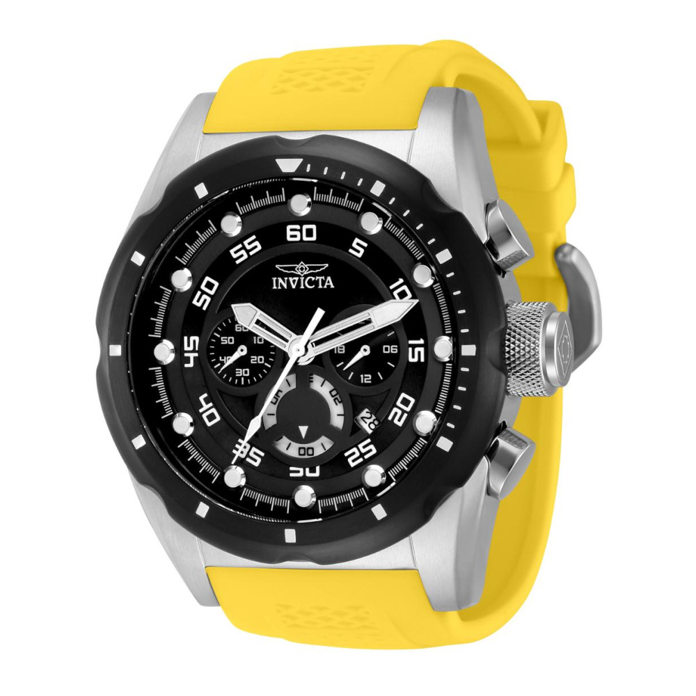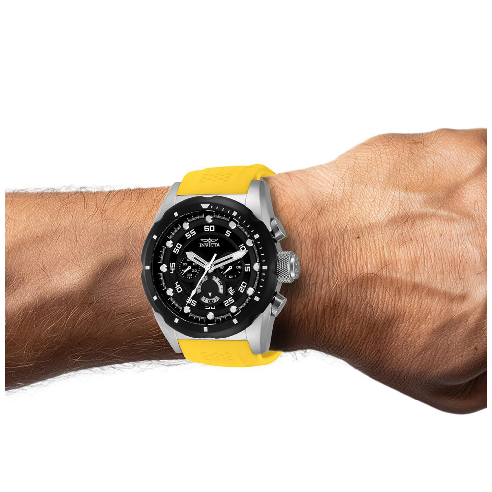 Este incrível relógio Invicta da coleção Speedway oferece um movimento Quartz exato, com uma incrível caixa de aço. O mostrador exibe um mostrador preto em madrepérola protegido pelo nosso exclusivo Flame Fusion Crystal. O design é completado por uma faixa de silicone amarela. Este relógio pode resistir à água até 100 m.