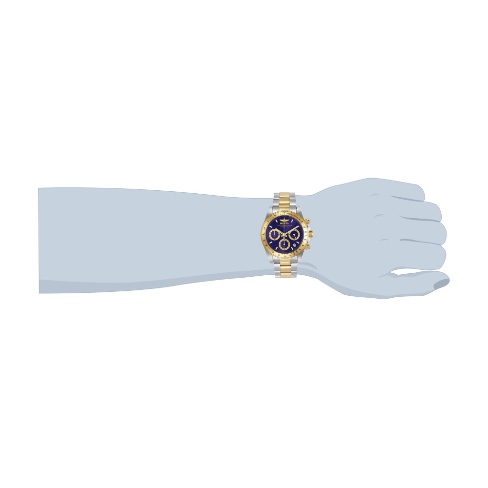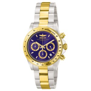 Este relógio Invicta da coleção Speedway possui um movimento de quartzo e apresenta uma robusta caixa de aço em ouro. Em sua face, você pode encontrar um mostrador de metal azul coberto por um cristal mineral durável. Este estilo é finalizado por uma pulseira confiável de aço inoxidável prateado e dourado e oferece resistência à água de 200 m.