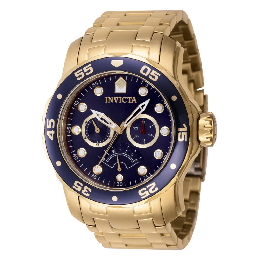 Este atraente relógio Invicta da coleção Pro é alimentado por um movimento preciso, com uma caixa dourada