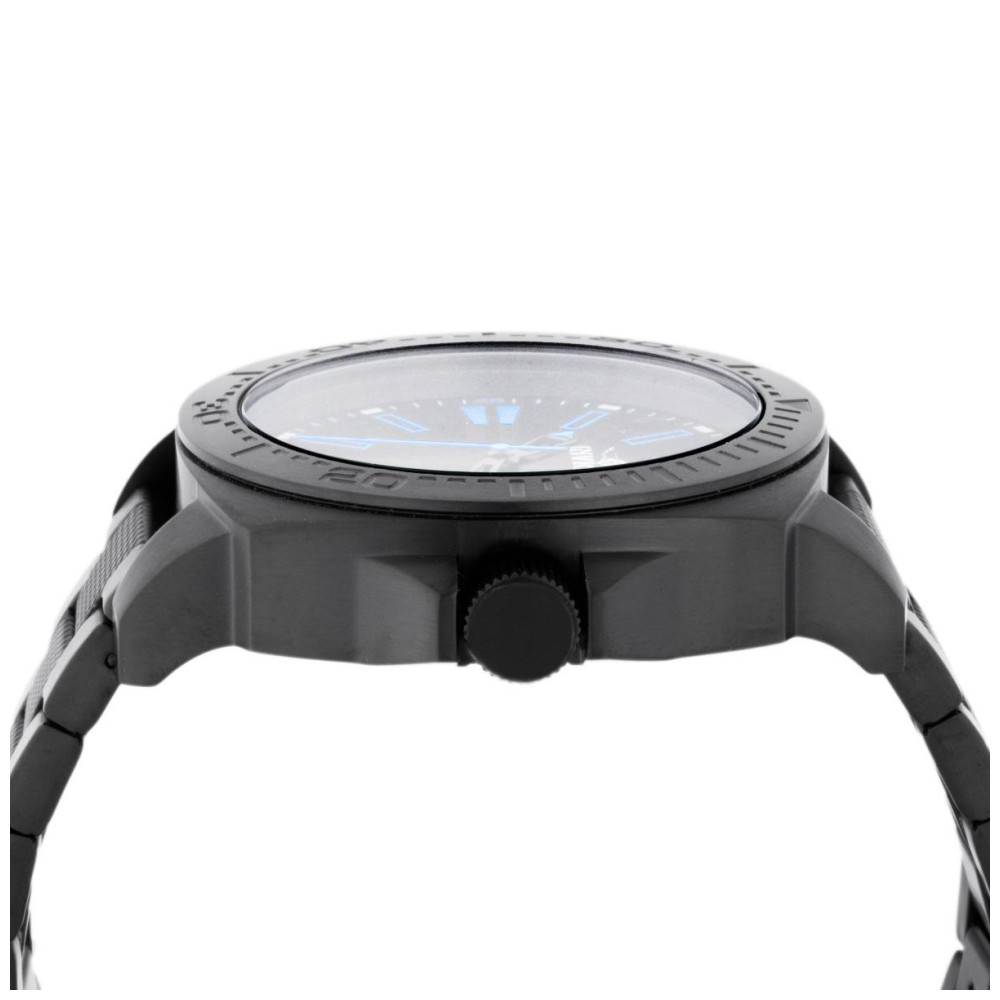 Uma pulseira preta completa este relógio que pode resistir à água por até 50 m
