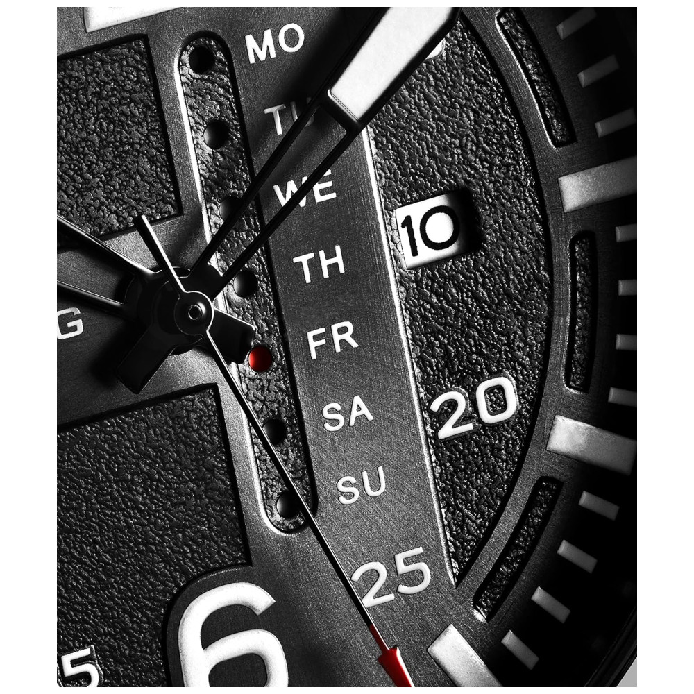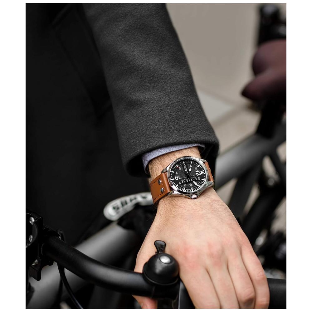 ESTILO DE EDIÇÃO A aparência atraente é impressionante e funcional. Pulseira Couro Faixa de couro , elegante e confortável, com rebites de aço inoxidável. FÁCIL DE LER Mãos, números e marcadores luminosos permitem que você informe a hora no escuro. A função Data oferece o dia da semana e o dia do mês.
