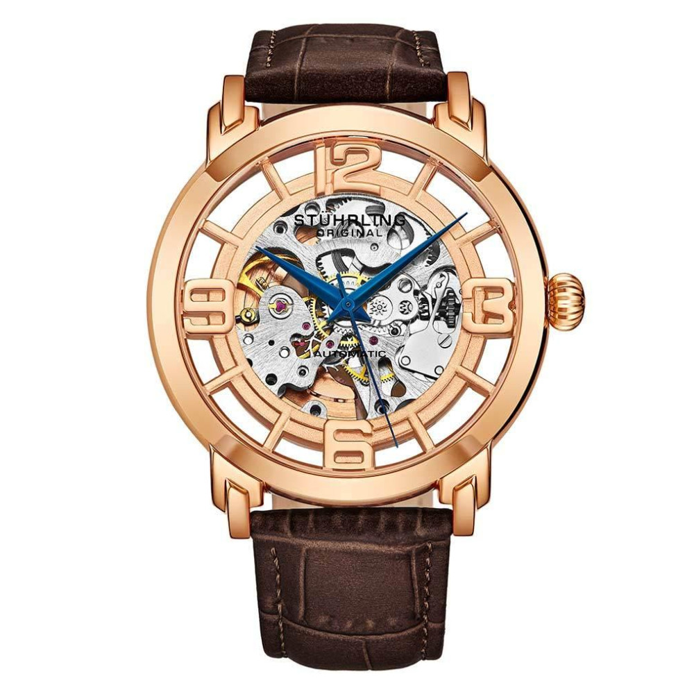Relógio Stuhrling Winchester 3964L Automático 42mm Ouro Rosa com Pulseira de Couro Marrom e Fivela Tang em Ouro Rosa