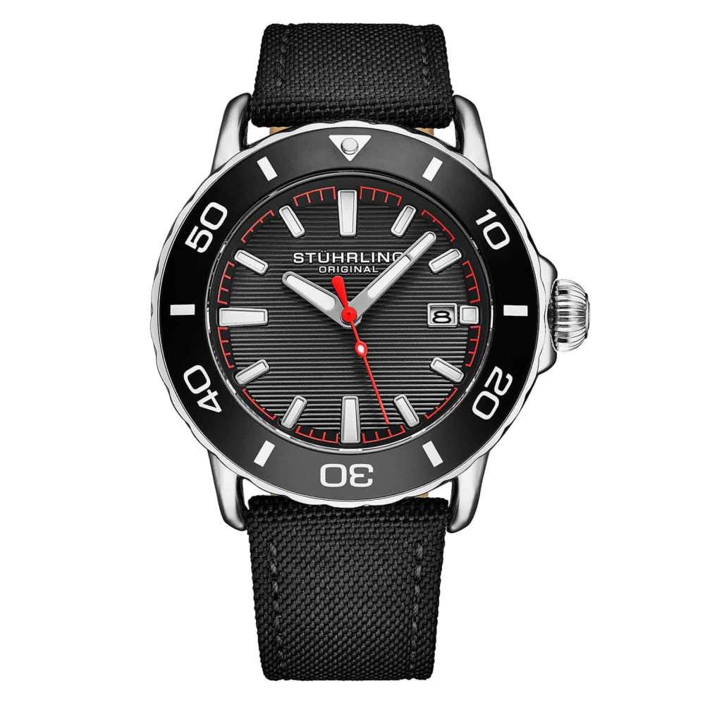 Relógio Voyager 4049 mostrador preto pulseira e moldura pretas marcadores brancos Stuhrling.