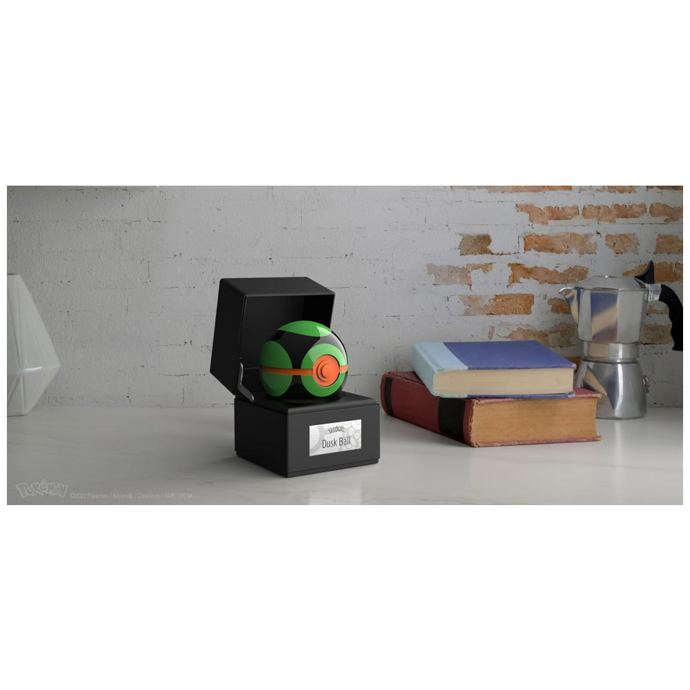 O botão frontal integra tecnologia de sensor de proximidade e movimento, acionando iluminação multicolor que pode alterar a cor fixa ou executar sequência luminosa que simula captura de Pokémon. A base expositora com tampa eleva a Dusk Ball quando aberta e conta com iluminação interna, destacando a esfera durante o uso em modo display.
