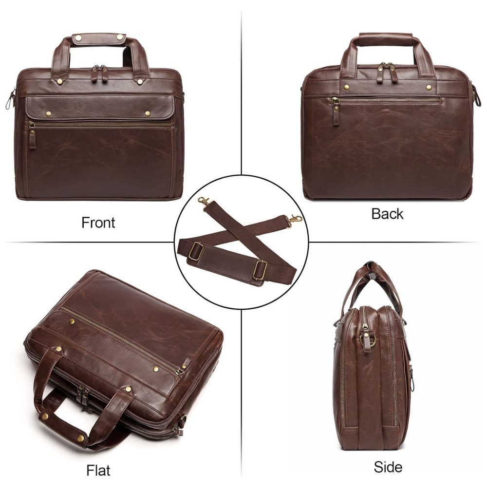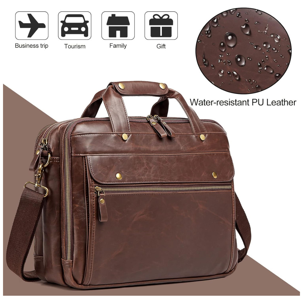 Durável e à prova dágua A bolsa de mensageiro para laptop é forro de tecido durável e as partes de metal são feitas de bronze. A parte de metal torna a pasta mais durável para suportar mais peso. O couro à prova dágua pode ser com mau tempo, sempre que você levar coisas importantes para sair