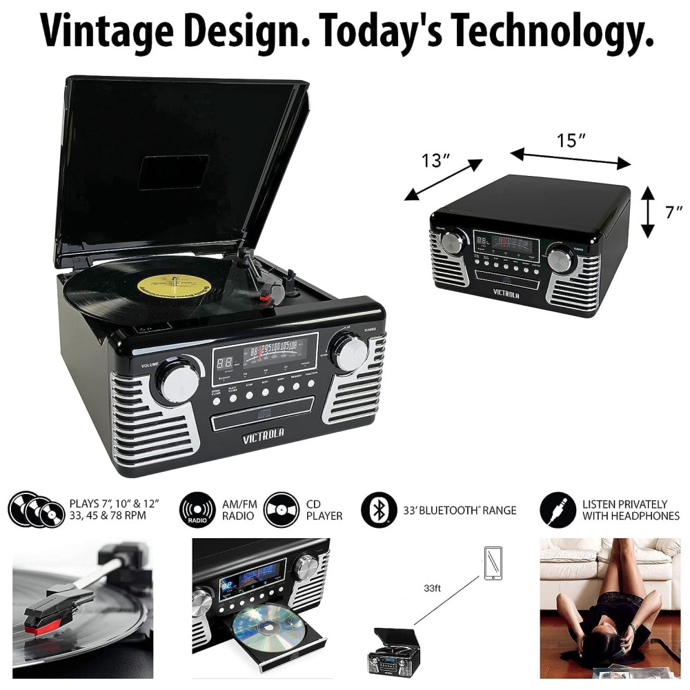 NÃO É NECESSÁRIO SISTEMA ESTÉREO OU EQUIPAMENTO EXTRA. Coloque o em funcionamento em minutos. A aparência retro combinada com a conveniência da tecnologia moderna tornam este toca discos um grande valor ideal para iniciantes e entusiastas do vintage