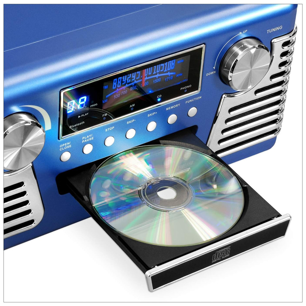 MAIS DO QUE UM RECORD PLAYER Com visual retrô dos anos 50 e recursos modernos, este toca discos reproduz e grava seus vinis em MP3 software Mac , PC e cabo USB incluídos. Tem um CD player, rádio AM , FM, Bluetooth, Aux e fone de ouvido, além de alto falantes estéreo