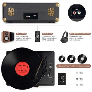 Suporte a registros de 3 tamanhos de17 x 25 x e 3 velocidades de 33, 45, 78 RMP de velocidades de reprodução. O sistema acionado por correia combina com o design técnico anti ressonância para obter melhor qualidade de som para você.