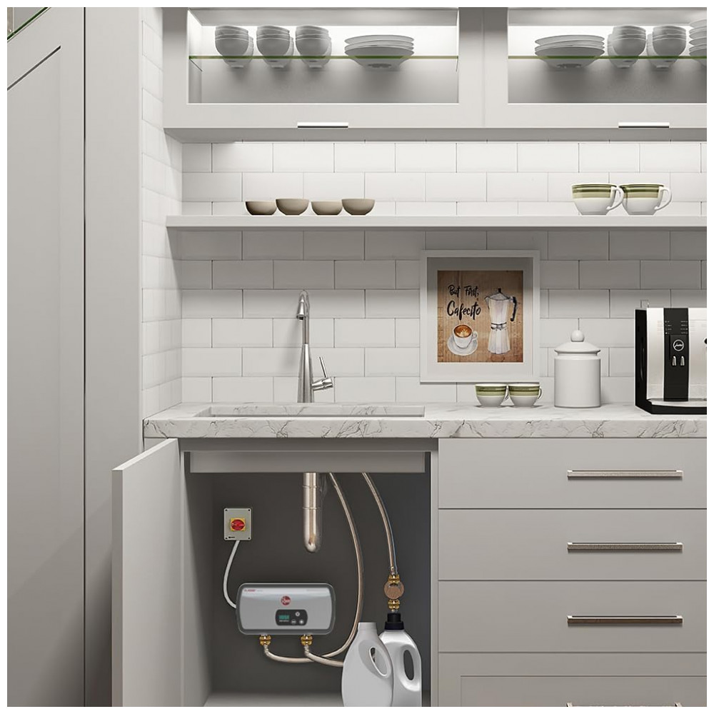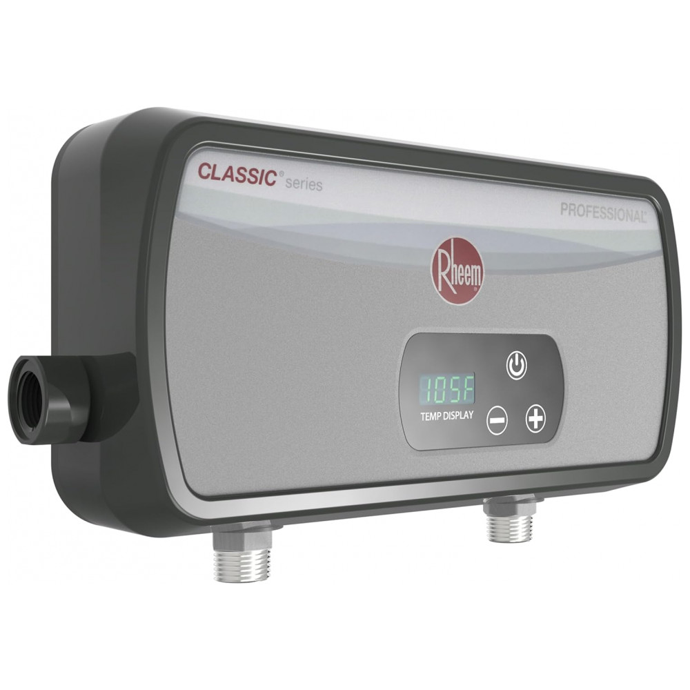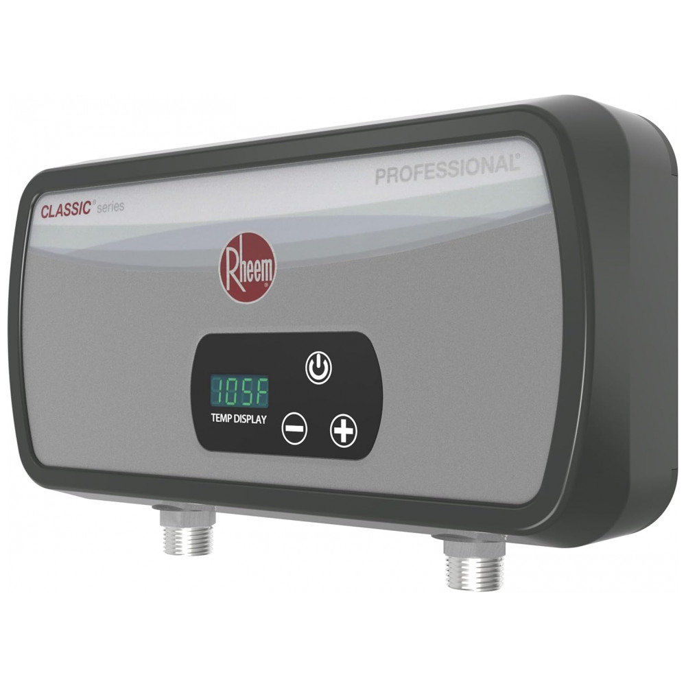 O Aquecedor Elétrico Sem Tanque Termostático Rheem Professional de 3,5kW é ideal para aplicações residenciais e comerciais leves, proporcionando água quente instantânea e economizando água ao eliminar o tempo de espera para que a água quente alcance a torneira. Projetado para ser instalado diretamente no ponto de uso, é perfeito para ambientes com baixa vazão, como banheiros, bares molhados ou pias de garagem. Sua instalação requer conexão direta a 120 volts e um disjuntor bipolar de 30 amperes, garantindo segurança e eficiência. Compacto e econômico, este aquecedor é até 98% menor do que um aquecedor elétrico convencional, ideal para espaços reduzidos como escritórios e cozinhas pequenas. O controle termostático permite ajustes precisos de temperatura em incrementos de 1 grau, variando de 27°C a 60°C, oferecendo água quente consistente sob demanda. Além disso, o aparelho deve ser montado na posição vertical, com as conexões de entrada e saída de água na parte inferior, facilitando a instalação sem necessidade de ventilação.