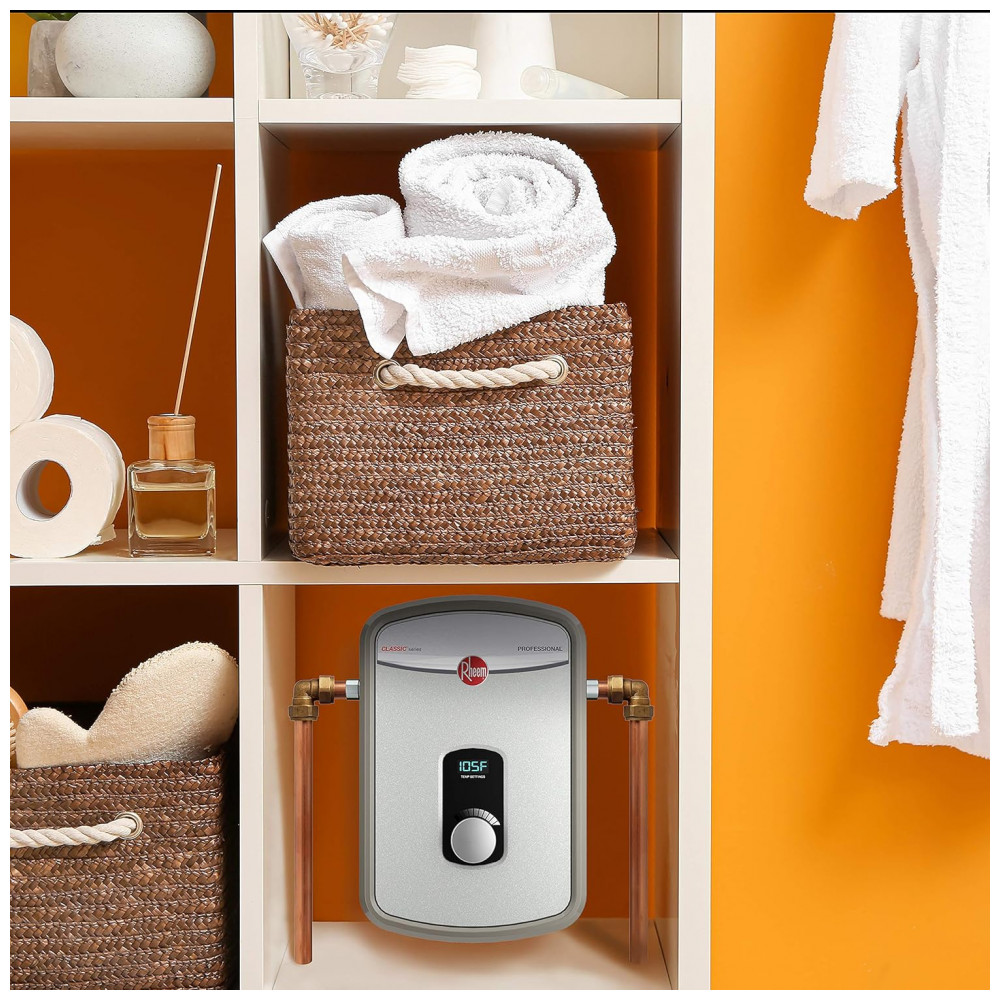 O Aquecedor Elétrico Sem Tanque Rheem RTEX-08 de 8kW é a solução ideal para quem busca água quente instantânea sem o incômodo de um tanque volumoso. Este aparelho eficiente e sustentável oferece até 7,4 litros por minuto (1,95 galões) a 240 volts, garantindo água quente suficiente para as necessidades da sua casa, ocupando espaço mínimo. Com design compacto, o RTEX-08 é fácil de instalar e perfeito para aplicações pontuais, proporcionando água quente confiável sempre que você precisar. Equipado com controle de botão liga/desliga e visor digital ajustável de temperatura, ele possui controle de energia automodulante que otimiza o consumo. Possui conexões laterais de água com rosca NPT 12 polegadas (30,48 cm) para maior praticidade e sistema de aquecimento sob demanda, oferecendo água quente contínua e imediata. Ideal para banheiros, cozinhas, lavanderias e pontos específicos, o Rheem RTEX-08 une tecnologia avançada e economia de espaço para transformar o seu conforto diário.