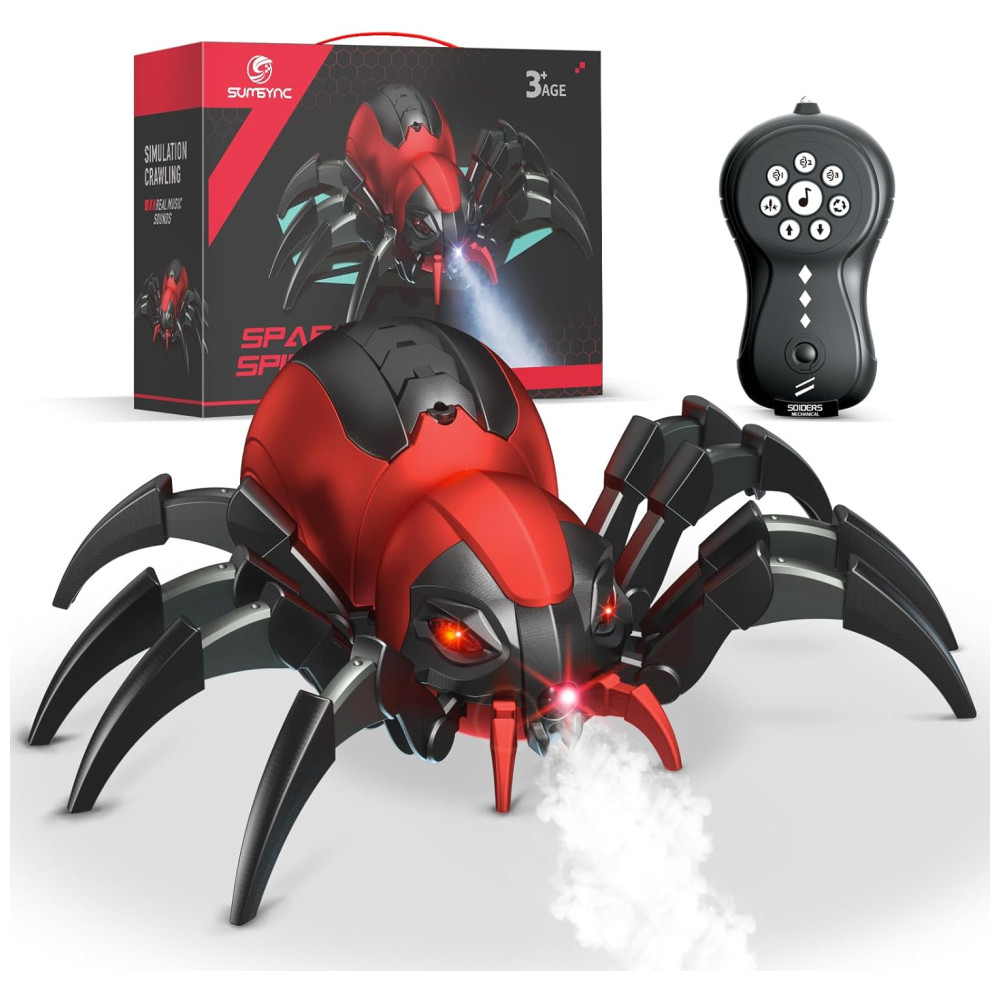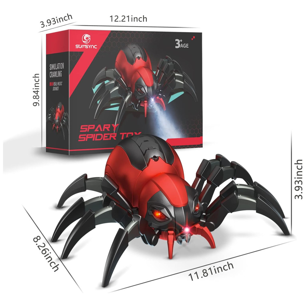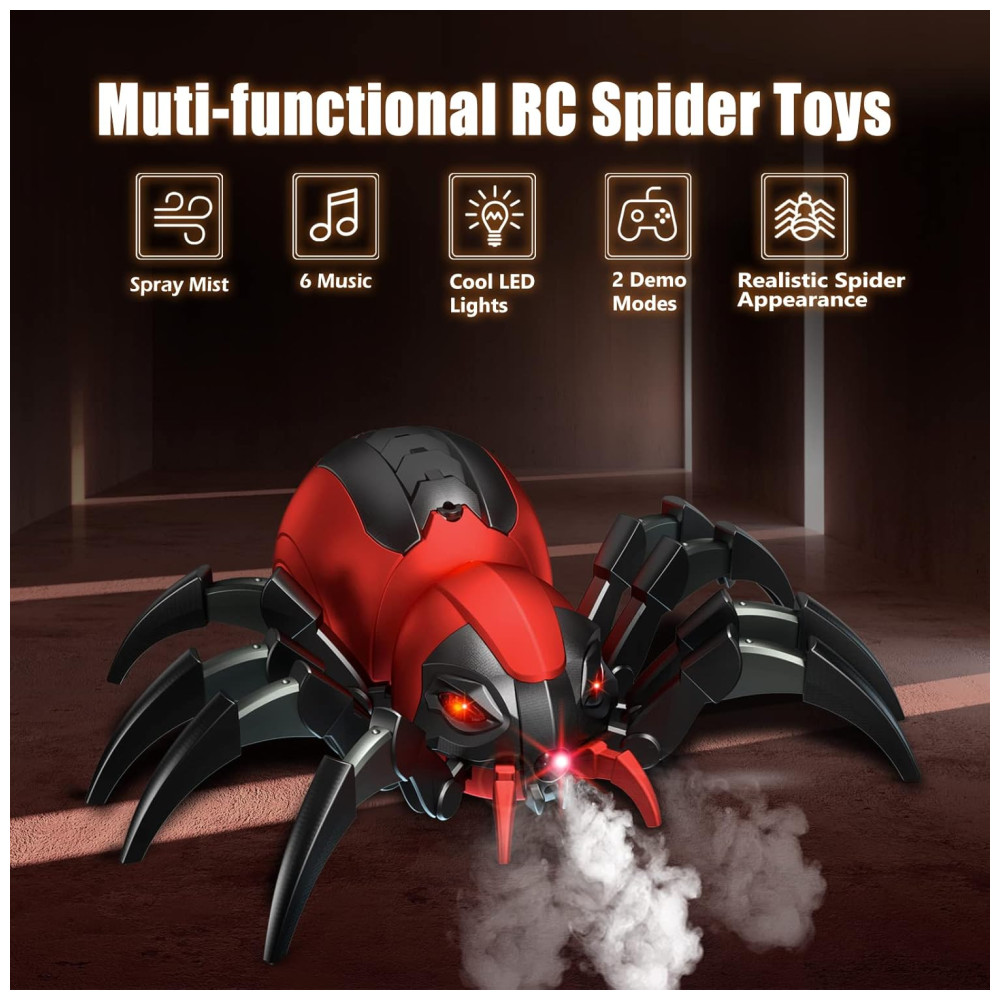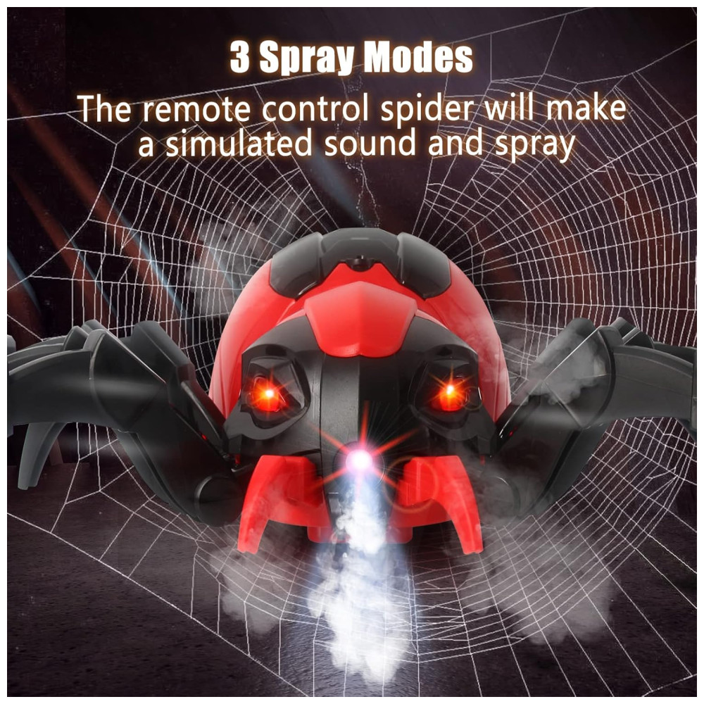 Cool LED Lighting Effects O brinquedo de aranha com controle remoto tem olhos de LED vermelhos brilhantes em sua cabeça que emitem um efeito de piscar lento enquanto se move e pulveriza. A boca do robô aranha também possui efeitos de iluminação vermelho e azul, que ficam muito legais ao borrifar no escuro. Crianças e adultos vão achar muito interessante.