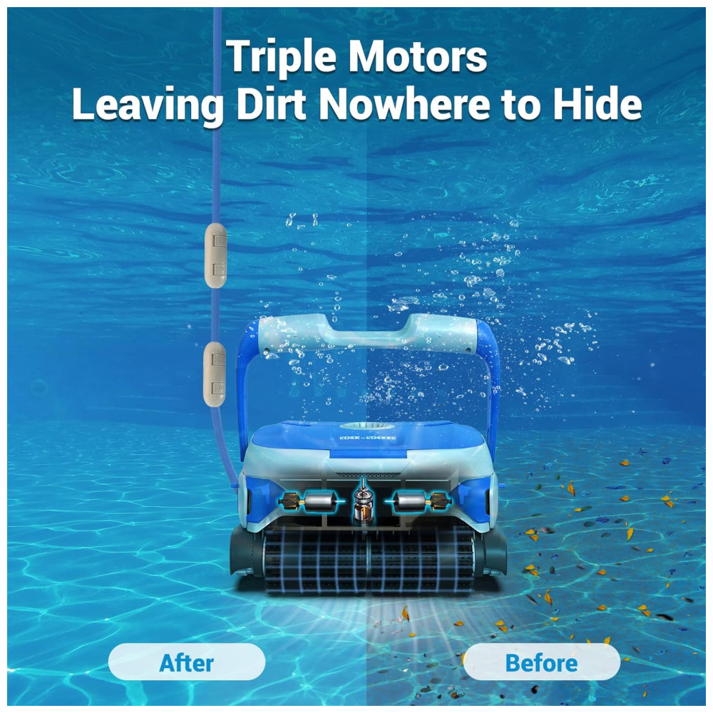 Este robô limpador de piscinas possui motores triplos potentes que garantem uma limpeza profissional e eficiente. Com sua capacidade de limpeza IPX8 e desempenho de filtragem de 71GPM, é capaz de limpar poeira, detritos e folhas da piscina rapidamente. Possui função de escalada em parede, proporcionando forte adsorção e excelente limpeza sem se preocupar com quedas.