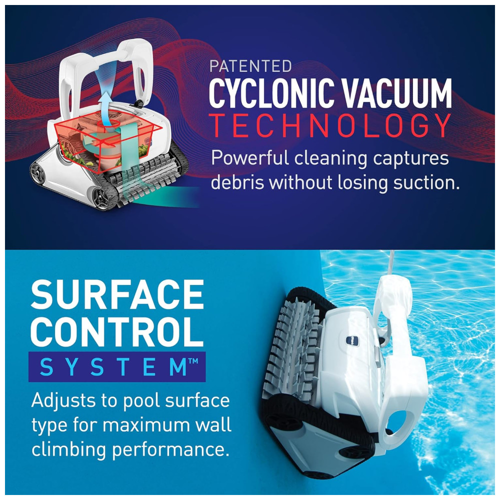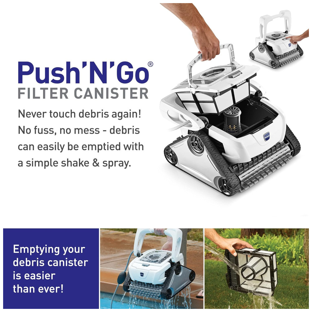 O recipiente do filtro PushNGo permite fácil remoção de detritos junto com uma grande janela de visualização transparente. O sistema de controle de superfície ajusta as configurações da superfície da piscina para uma escalada ideal na parede. Possui ainda um ciclo de limpeza duplo para ciclos de limpeza sob demanda com um toque e um transportador durável para fácil transporte.