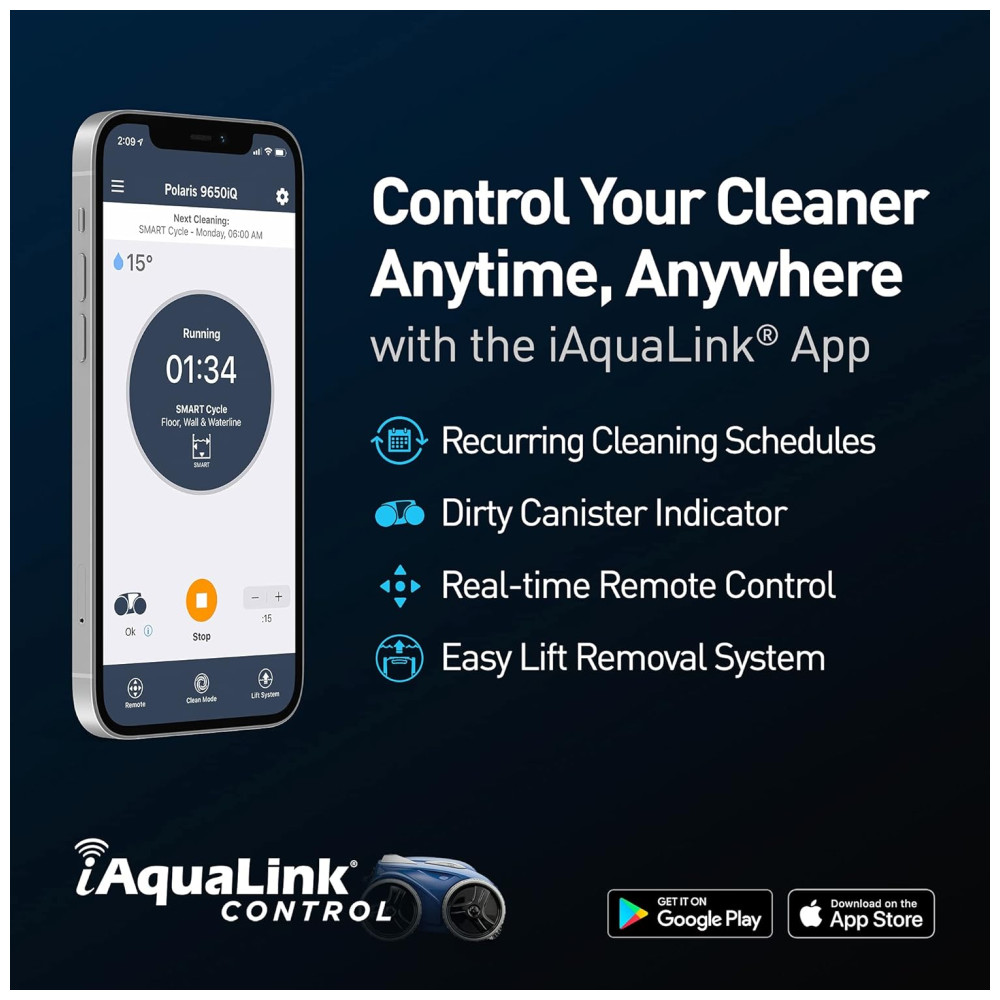 O Polaris 9650iQ Sport é um limpador robótico de piscina 4WD que oferece desempenho de limpeza premium. Com o aplicativo iAquaLink, você pode controlar o limpador facilmente a partir do seu telefone, sem precisar estar na piscina. O 9650iQ Sport vem com uma conexão WiFi integrada que permite o controle do aplicativo iAquaLink em tempo real e solução de problemas a partir do seu dispositivo inteligente.