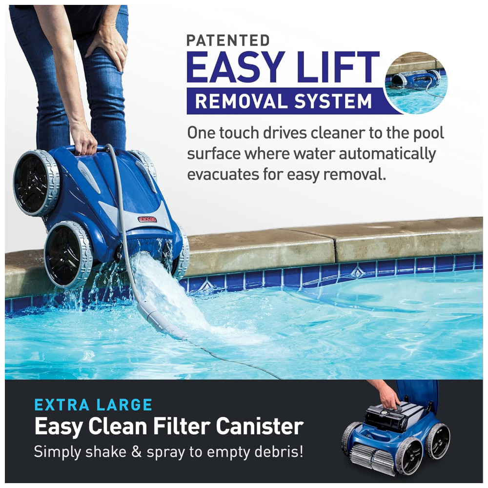 O limpador é compatível com piscinas enterradas de até 18,24 Metros e vem equipado com um cabo de 21,28 Metros com giro para redução de emaranhados e um recipiente extragrande de 5L para detritos.